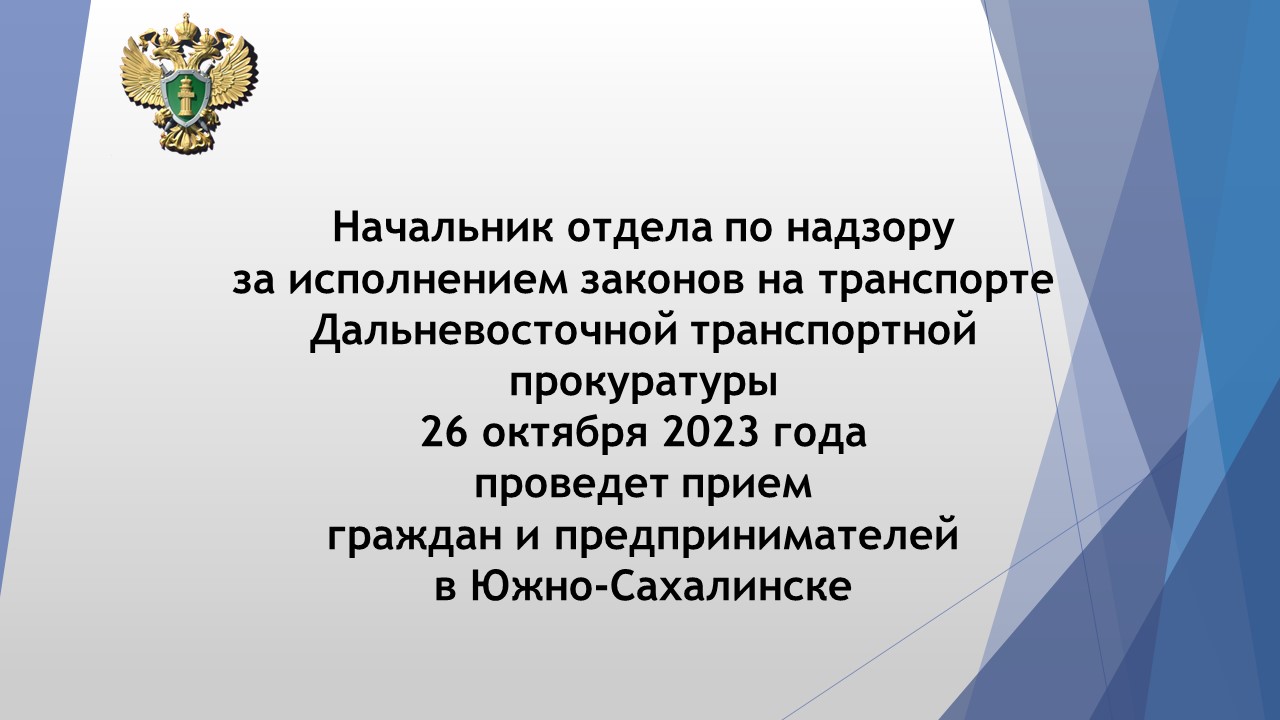 Начальник отдела по надзору за исполнением законов на транспорте Дальневосточной транспортной прокуратуры проведет выездной прием граждан и предпринимателей Сахалинской области