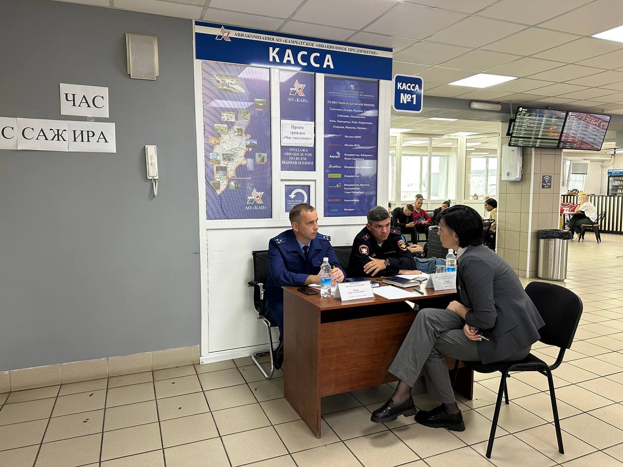 Камчатский транспортный прокурор Иван Нецвет совместно с временно исполняющим обязанности начальника Камчатского линейного отдела МВД России на транспорте Олегом Бутыриным провел социально-профилактическую акцию «Час пассажира» в аэропорту Петропавловск-Камчатский (Елизово).