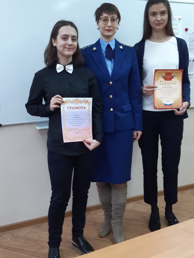 Заместителем Белгородского транспортного прокурора Юлией Смотровой 12 декабря 2019 года победителям конкурса Коротченковой М. и Линник П. вручены почетные грамоты.