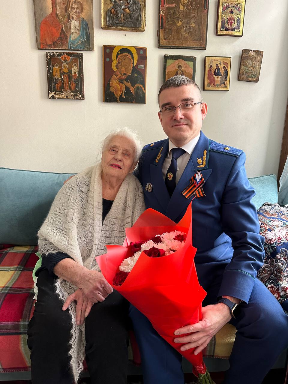 В преддверии Дня Победы исполняющий обязанности Московского межрегионального транспортного прокурора Юрий Городков, работники аппарата Московской межрегиональной транспортной прокуратуры поздравили с праздником ветерана Великой Отечественной войны Ксению Архиповну Алферову, которой не так давно исполнился 101 год.