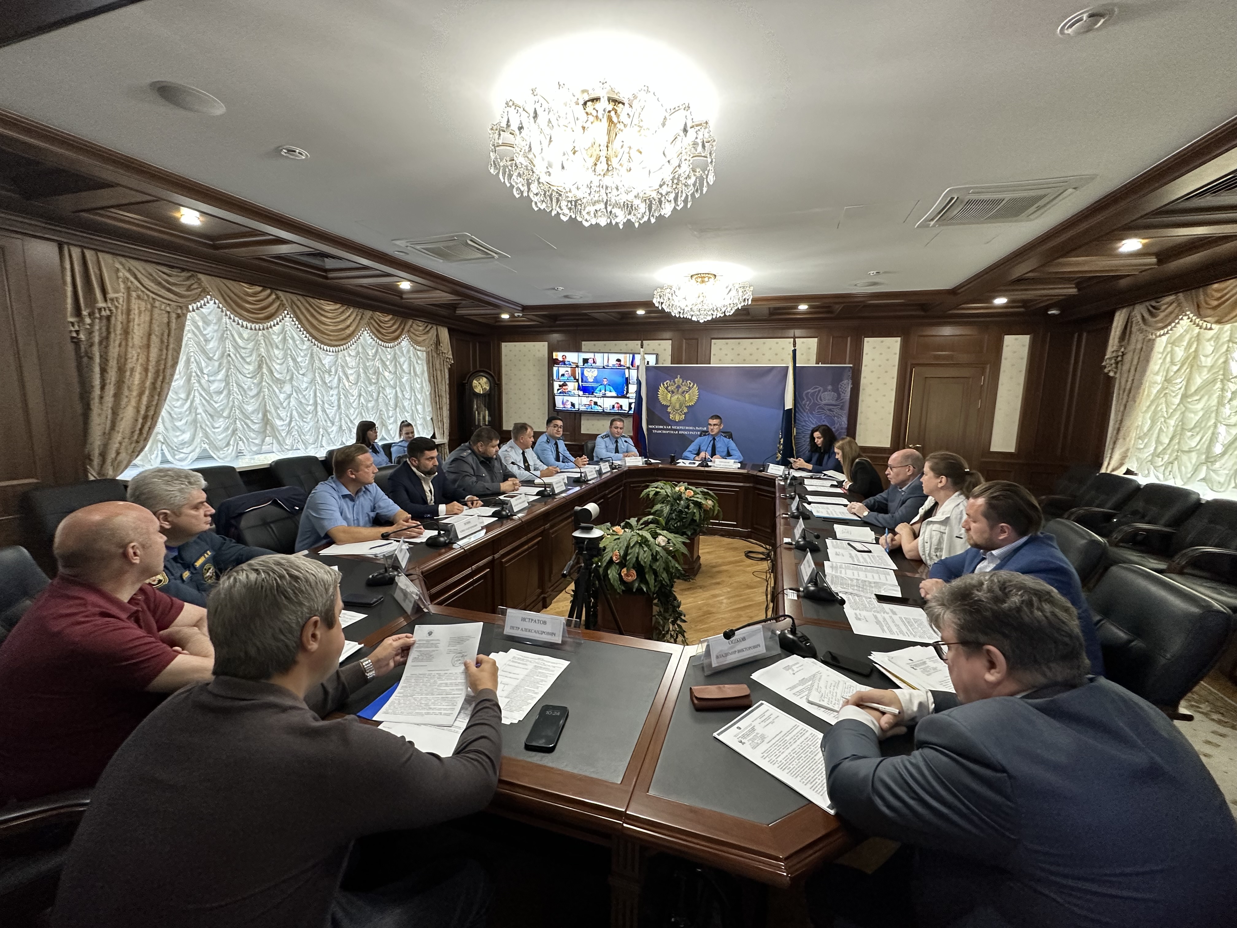 В заседании приняли участие работники аппарата прокуратуры, транспортные прокуроры (на правах районных), руководители Управления на транспорте МВД России по Центральному федеральному округу, подразделений Ространснадзора и Роспотребнадзора, Департамента транспорта и развития дорожно-транспортной инфраструктуры г. Москвы, Министерства транспорта и дорожной инфраструктуры Московской области, ГКУ «Центр организации дорожного движения» г. Москвы, ФАУ «Российское классификационное общество», ГИМС МЧС России по Москве и Московской области.