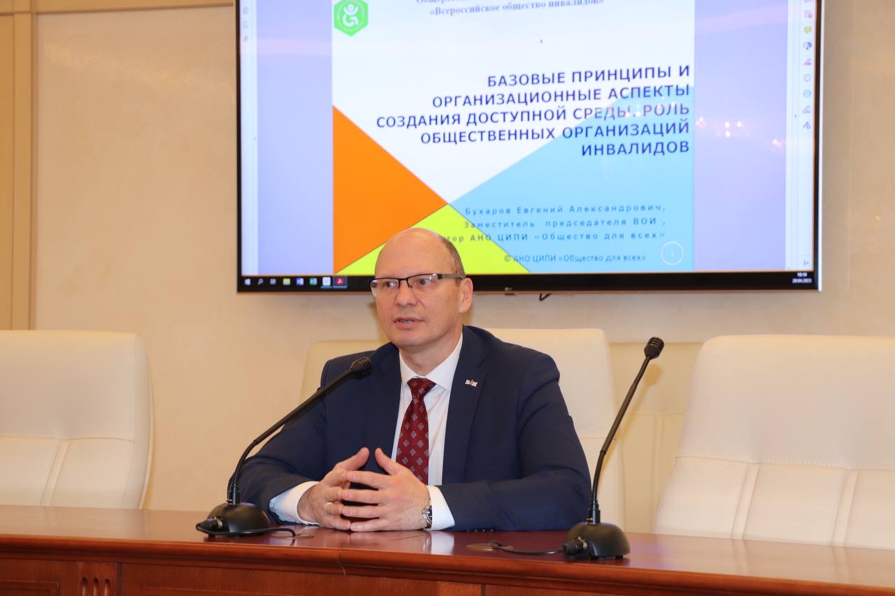 Евгений Бухаров в своем выступлении осветил базовые принципы создания доступной среды, рассказал о роли общественных организаций инвалидов в данной сфере, а также о нормативно-правовом регулировании и организационных аспектах обеспечения равного доступа к объектам транспорта и предоставляемым на них услугам.