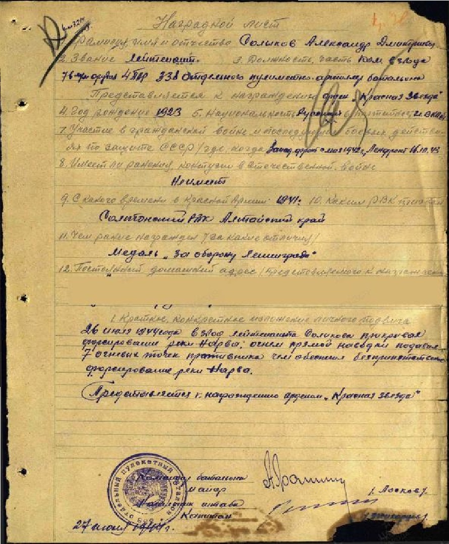 Из документальных источников: «26.07.1944 лейтенант Солыков А.Д., исполняя приказ о форсировании р. Нарва, огнем прямой наводки подпил 7 огневых точек противника, чем обеспечил беспрепятственный проход войск Красной Армии. За проявленное мужество был представлен к ордену «Красной Звезды.»