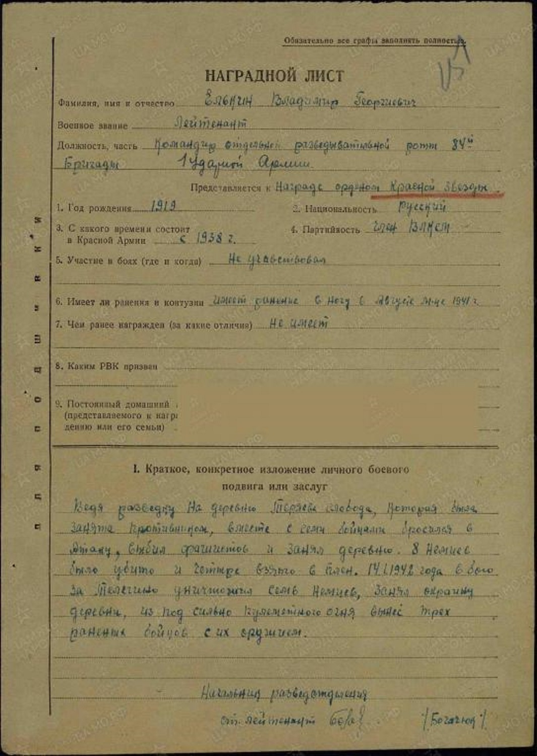 Из наградного листа командира отдельной разведовательной роты 84-й Бригады 1-й Ударной Армии, лейтейнанта Елкина В.Г. «Ведя разведку на деревню Теряева Слобода, которая была занята противником, вместе с семи бойцами бросился в атаку, выбил фашистов и занял деревню. 8 немцев было убито и четыре взято в плен. 14.1.1942 в бою за Телегино уничтожил семь немцев, занял окраину деревни, из-под сильного пулеметного огня вынес трех раненых бойцов с ихз оружием».