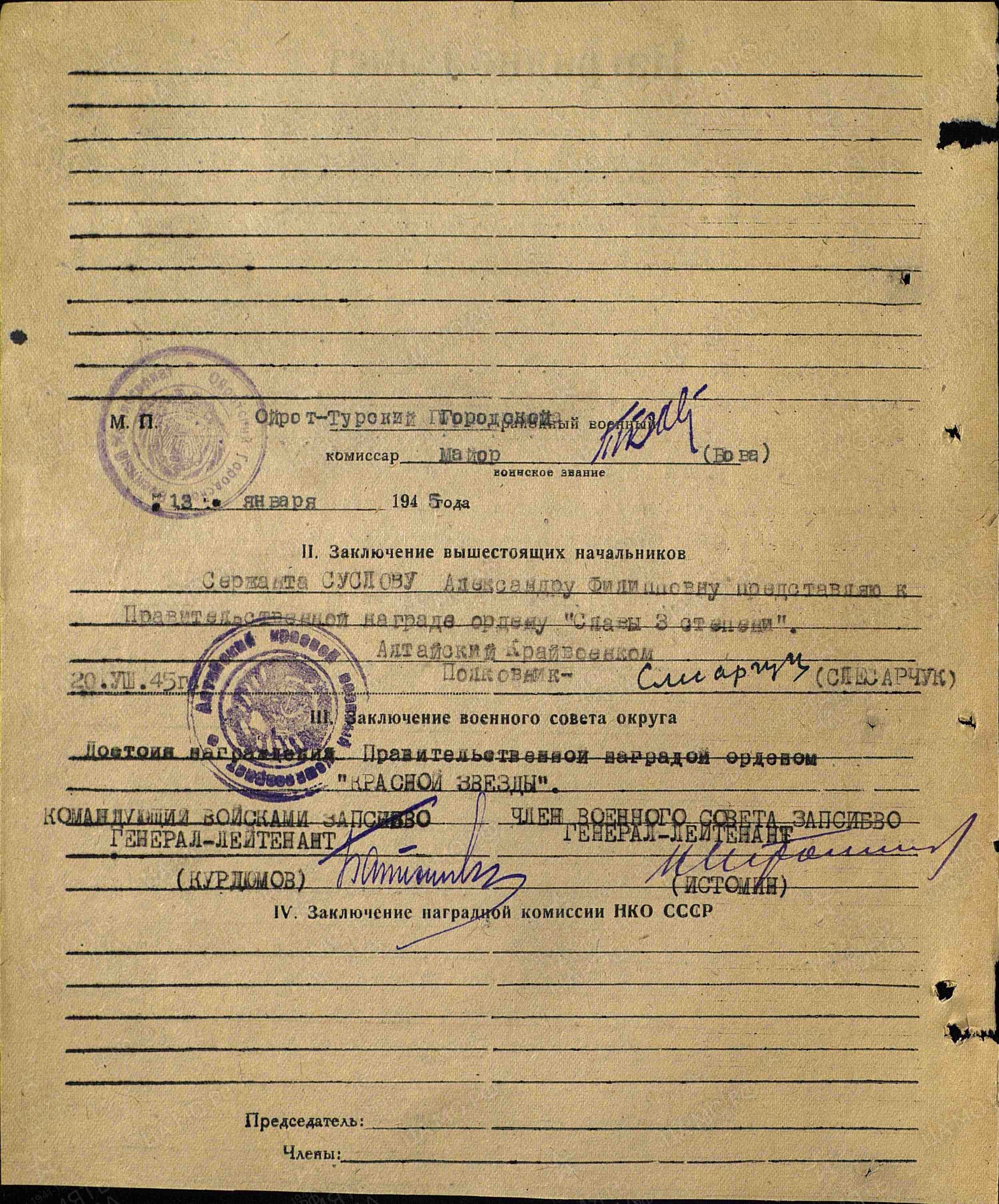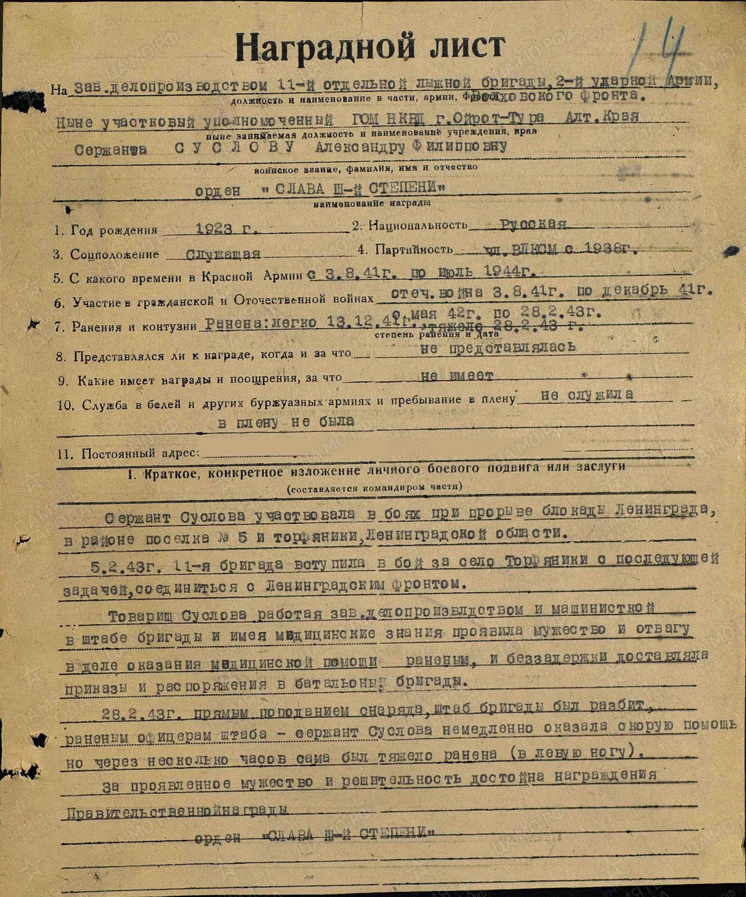 28.02.1943 прямым попаданием снаряда штаб бригады был разбит. Раненым офицерам штаба сержант Суслова немедленно оказала первую медицинскую помощь, а через несколько часов была ранена в ногу.