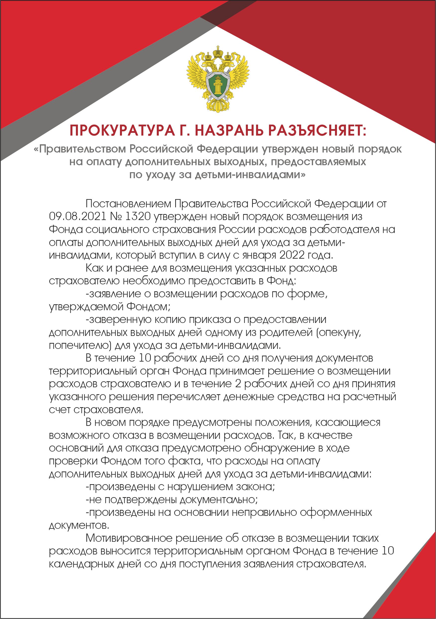 Прокуратура г.Назрань разъясняет: "Правительством РФ утвержден новый порядок на оплату дополнительных выходных, предоставляемых по уходу за детьми-инвалидами"