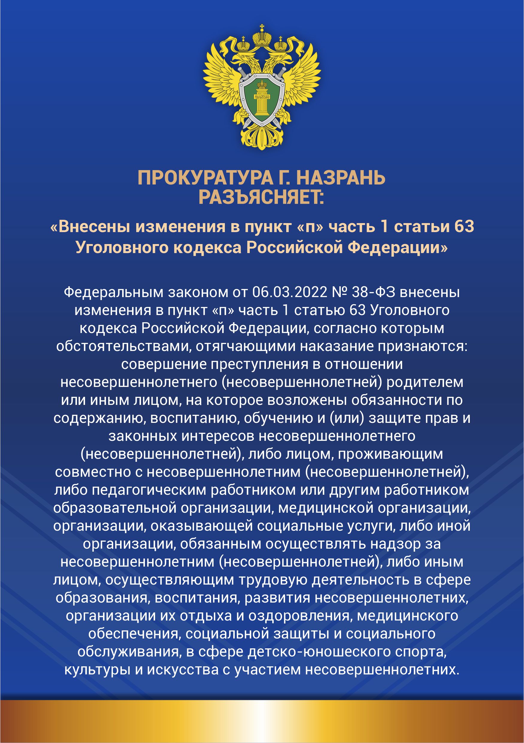Прокуратура г.Назрань разъясняет: "Внесены изменения в пункт "п" ч.1 ст.63 Уголовного кодекса Российской Федерации"