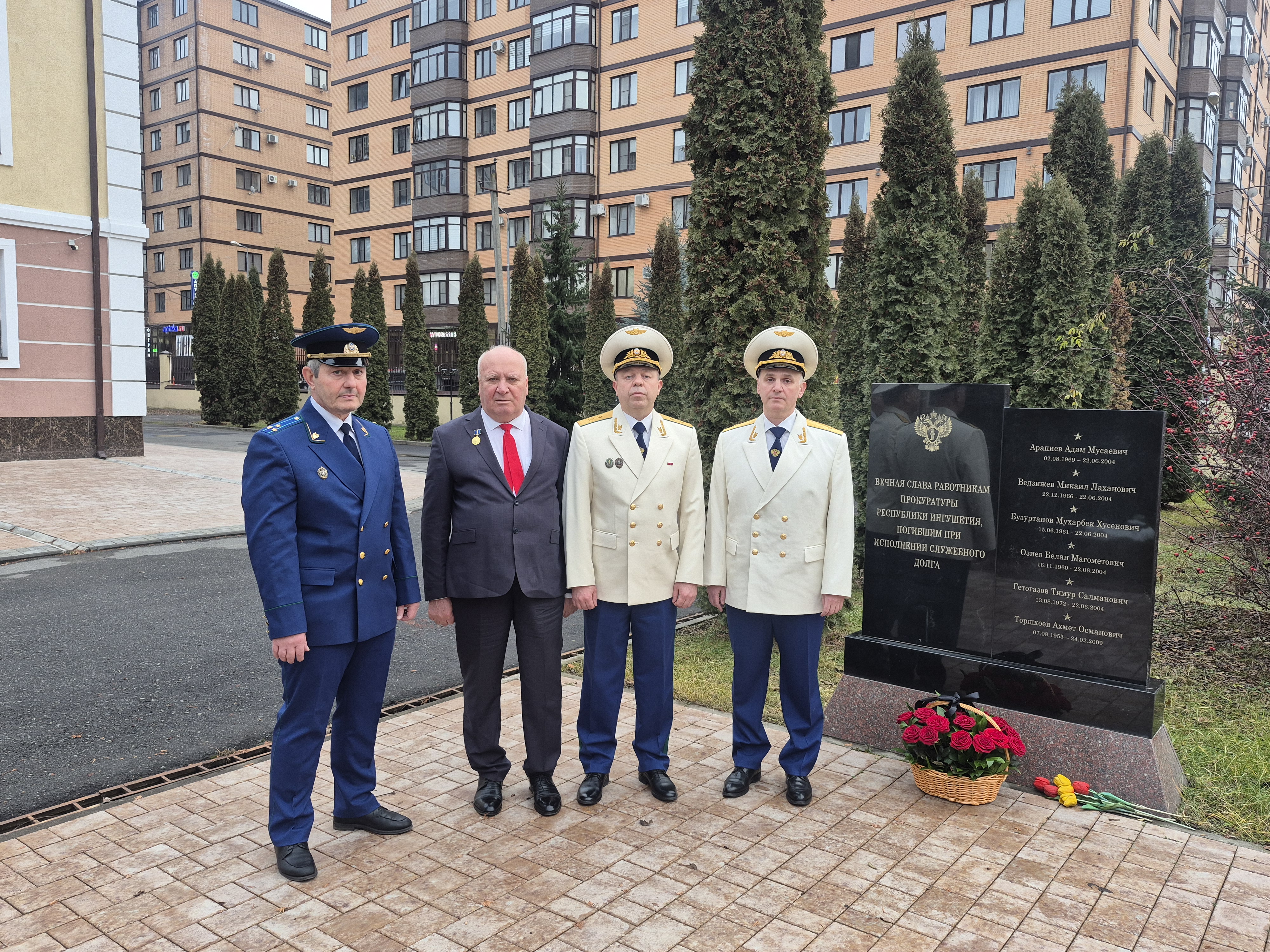 В своем выступлении прокурор республики отдельно отметил сотрудников прокуратуры, отдавших свои жизни при исполнении служебного долга. Это погибшие в 2004 г. в результате вооруженного нападения бандформирований на Ингушетию: прокурор г. Назрани Мухарбек Бузуртанов, его заместители Адам Арапиев и Микаил Ведзижев, следователь по особо важным делам прокуратуры Тимур Гетагазов, прокурор Назрановского района Билан Озиев, а также погибший в 2009 г. старший помощник прокурора республики по кадрам Ахмет Торшхоев. Их память присутствующие почтили минутой молчания.