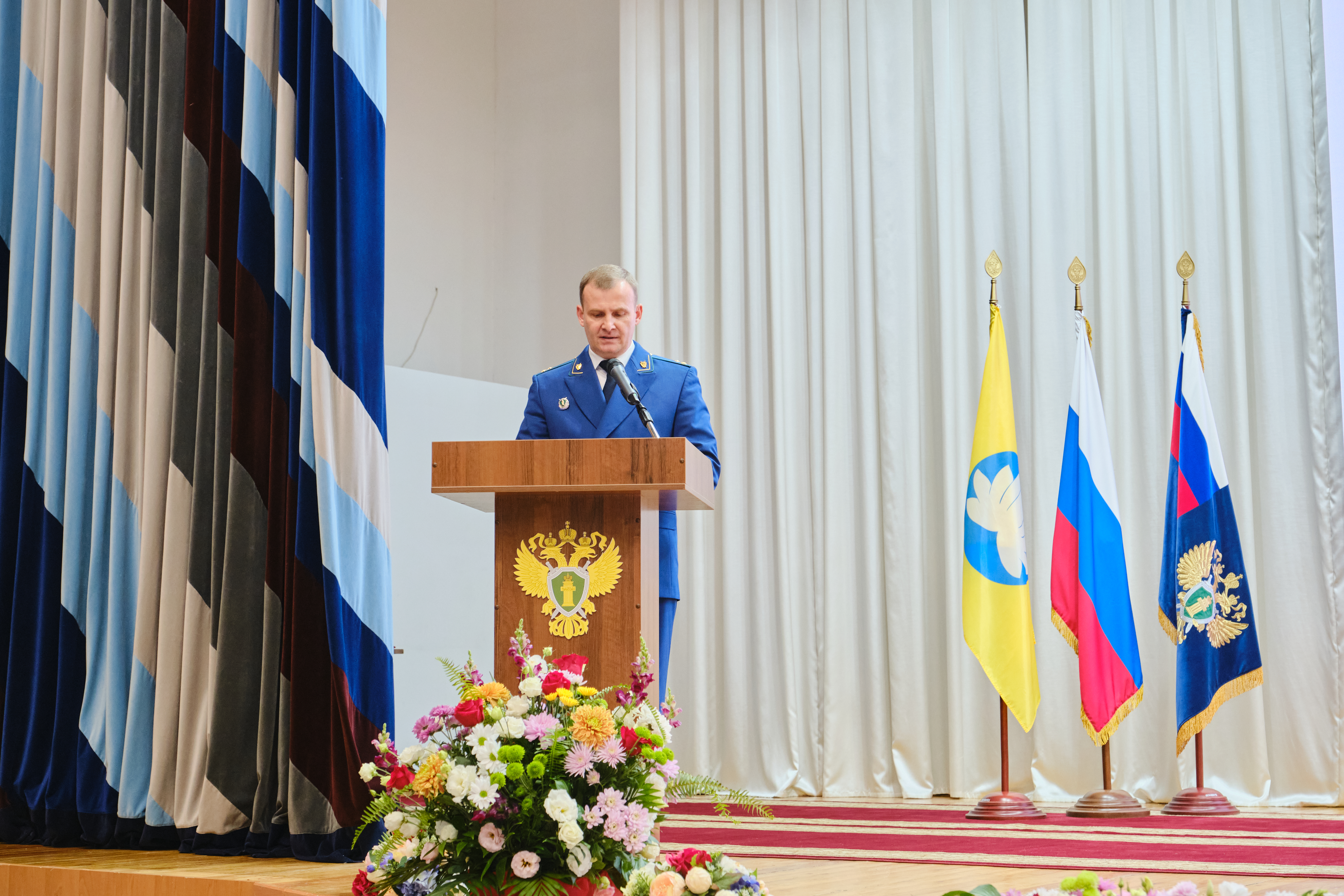 С приветственным словом к участникам торжественного собрания обратился прокурор Краснодарского края государственный советник юстиции 2 класса Сергей Табельский, который занимал должность прокурора Калмыкии с 2009 по 2013 гг., тепло поздравив коллектив прокуратуры республики и ветеранов Калмыкии.