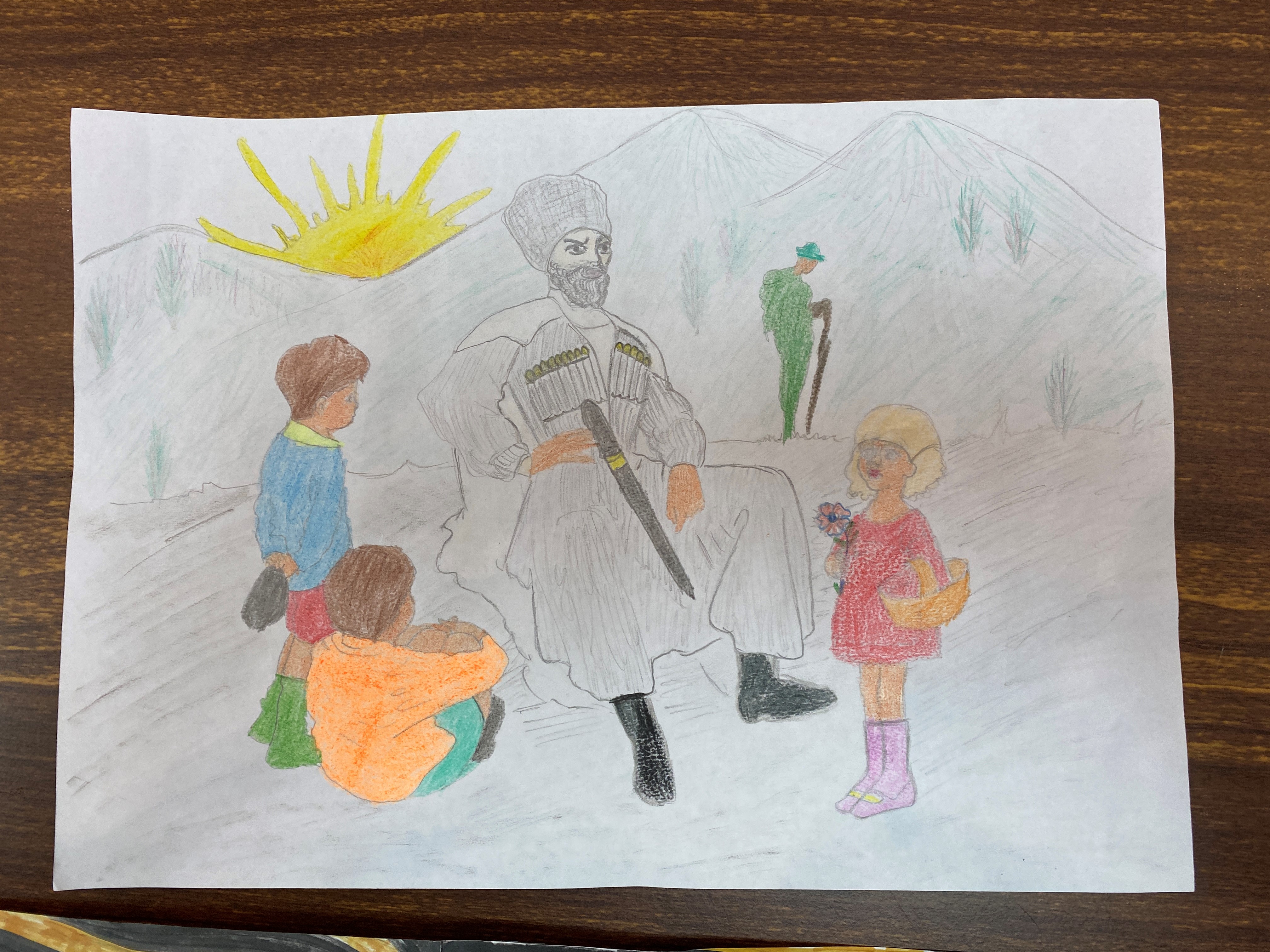 Рисунок учащегося 5-б класса МКОУ "Гимназия № 9 им.Хапсирокова К.Г.-Х." Алима Кечерукова на тему "Героическое прошлое Карачаево-Черкесии".