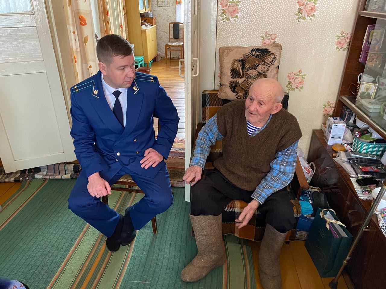 Гости побеседовали с ветераном, расспросили о жизни, поинтересовались, нужна ли ему какая-либо помощь, рассказали о полагающихся мерах социальной поддержки и напомнили об осторожности при общении по телефону с незнакомыми людьми, которые нередко оказываются мошенниками.