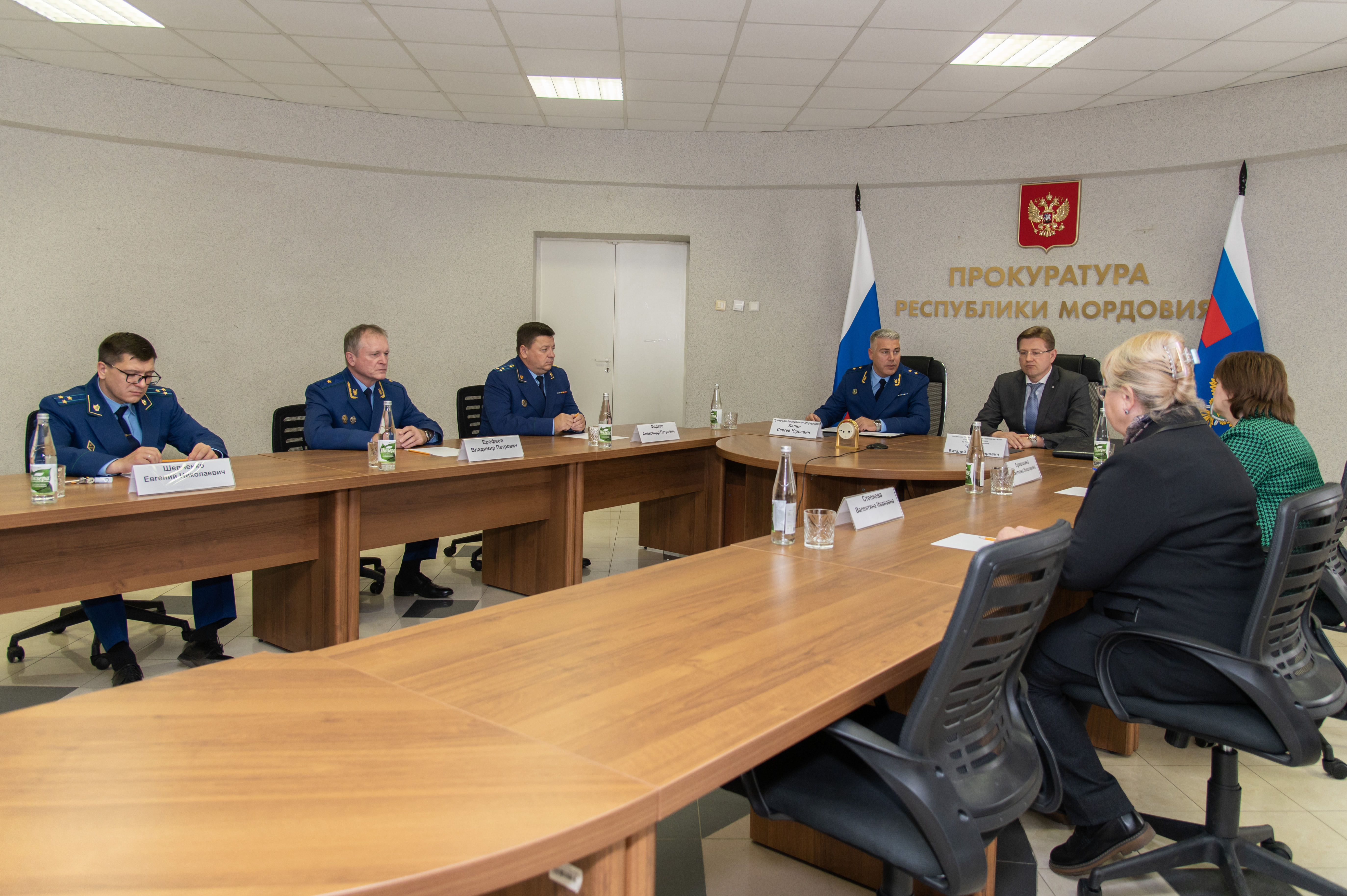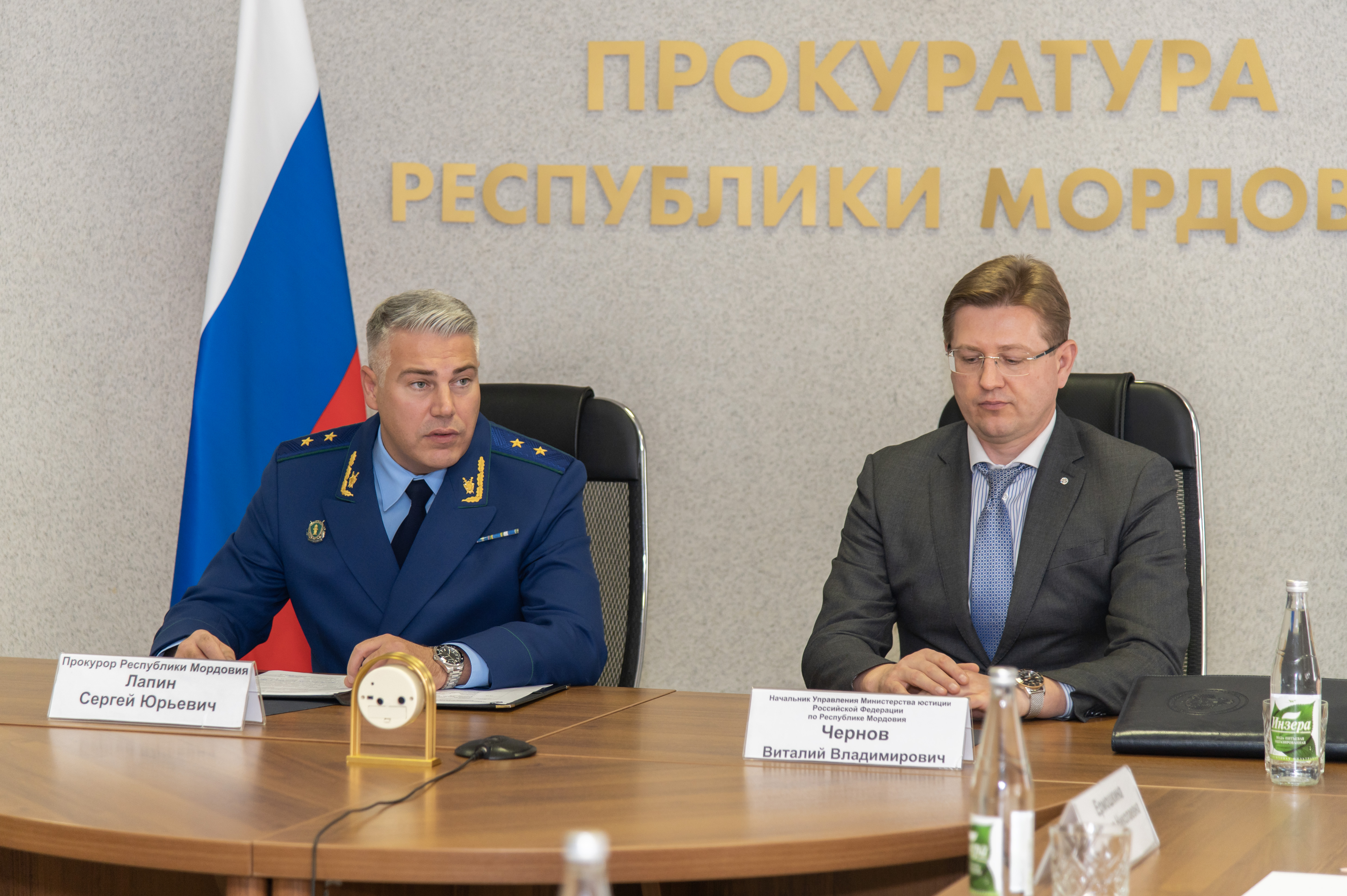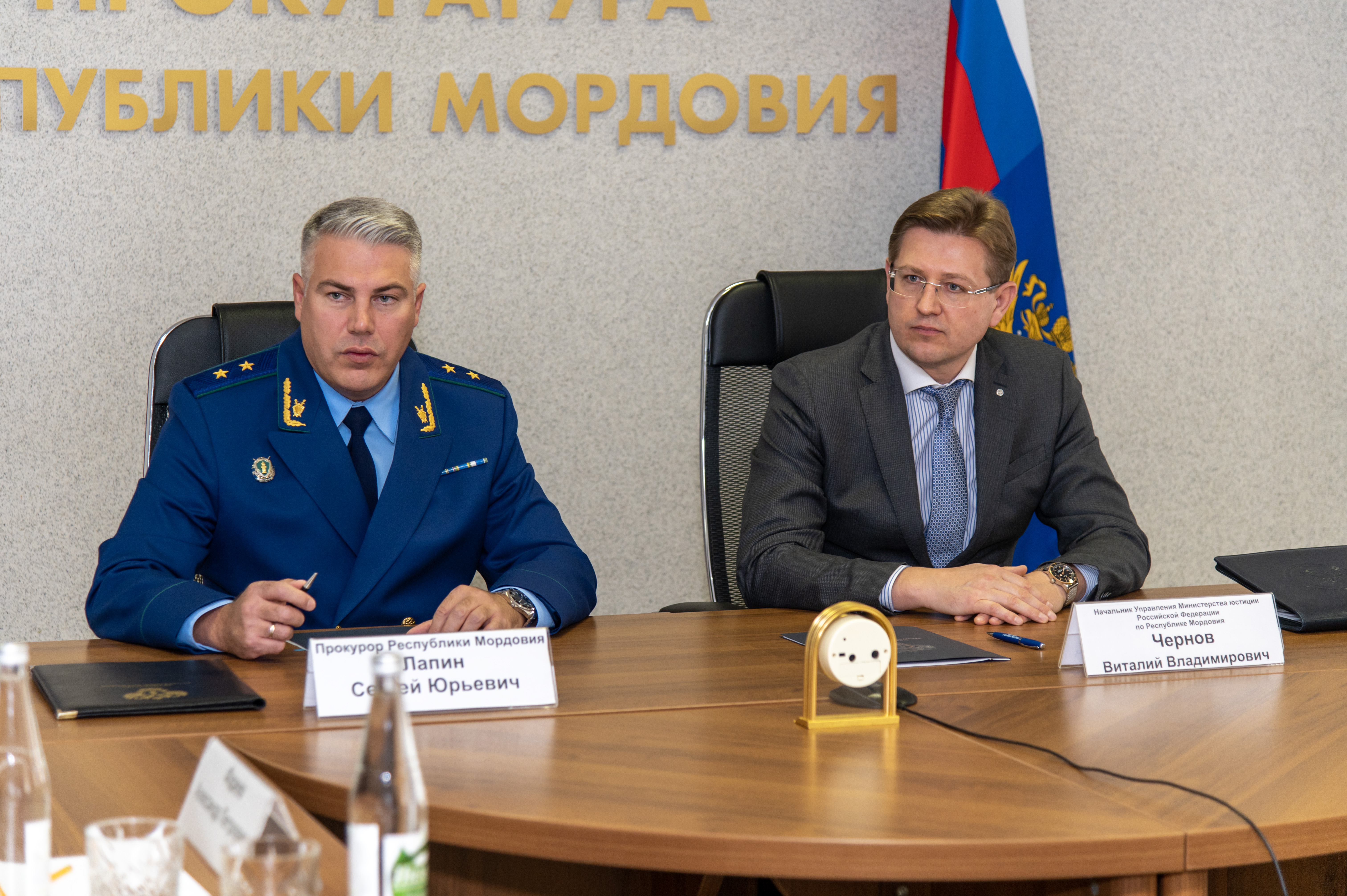 Сегодня, 2 октября 2025 года, состоялась рабочая встреча прокурора республики Сергея Лапина и начальника Управления Министерства юстиции Российской Федерации по Республике Мордовия Виталия Чернова.