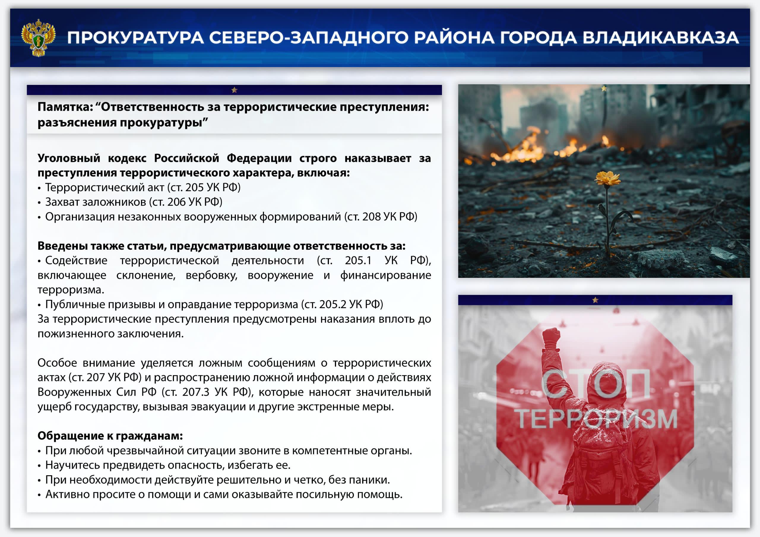Памятка, подготовленная прокуратурой Северо-Западного района г. Владикавказа, на тему: «Ответственность за террористические преступления»