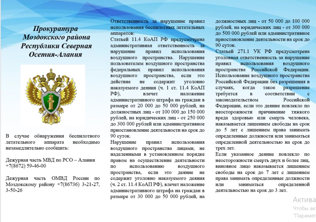 Памятка, подготовленная прокуратурой Моздок кого района, на тему: «Что делать, если заметил беспилотный летательный аппарат?»