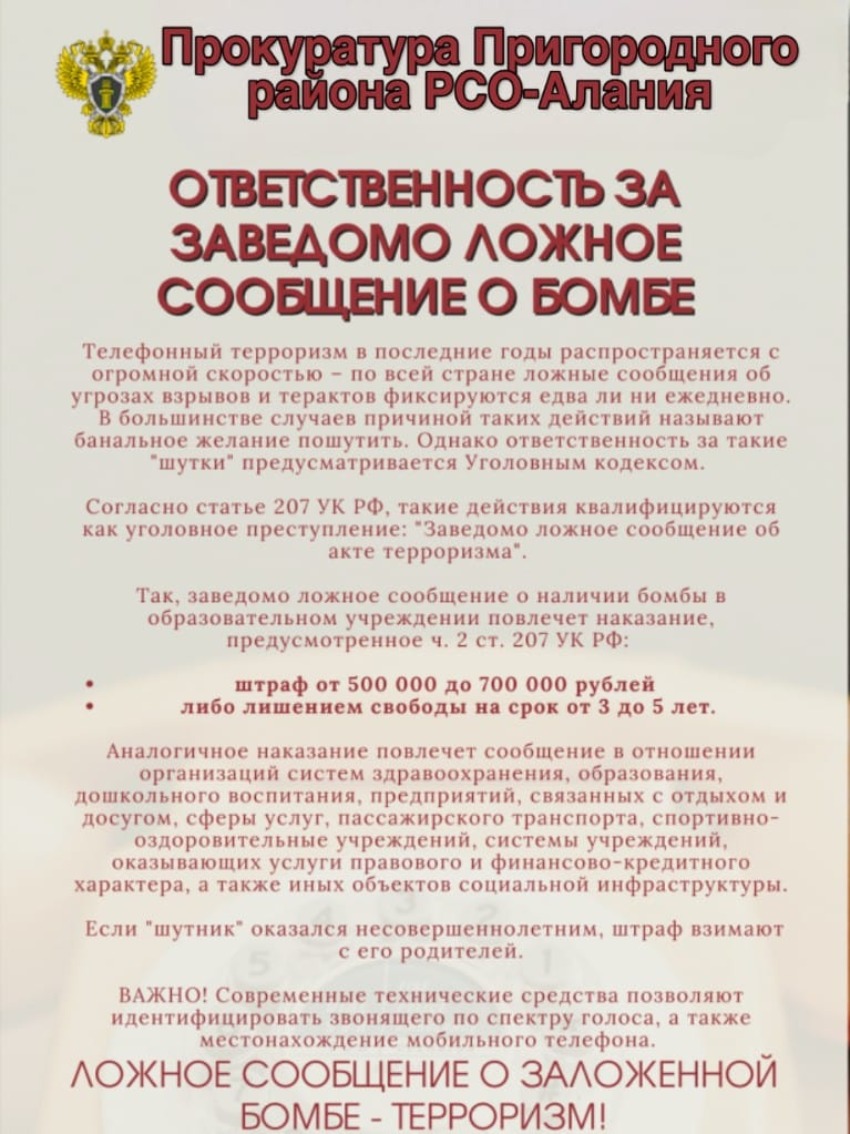Памятка, подготовленная прокуратурой Пригородного района РСО-Алания, на тему: «Ответственность за заведомо ложное сообщение о бомбе»