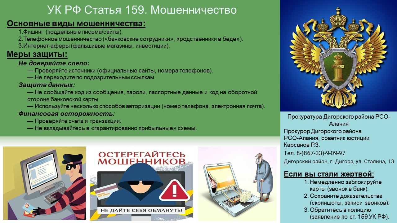 Памятка, подготовленная прокуратурой Диггорского района РСО-Алания, на тему: "Статья 159 УК РФ-Мошенничесство"