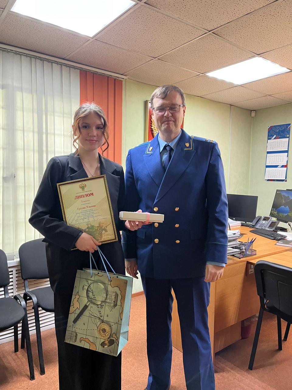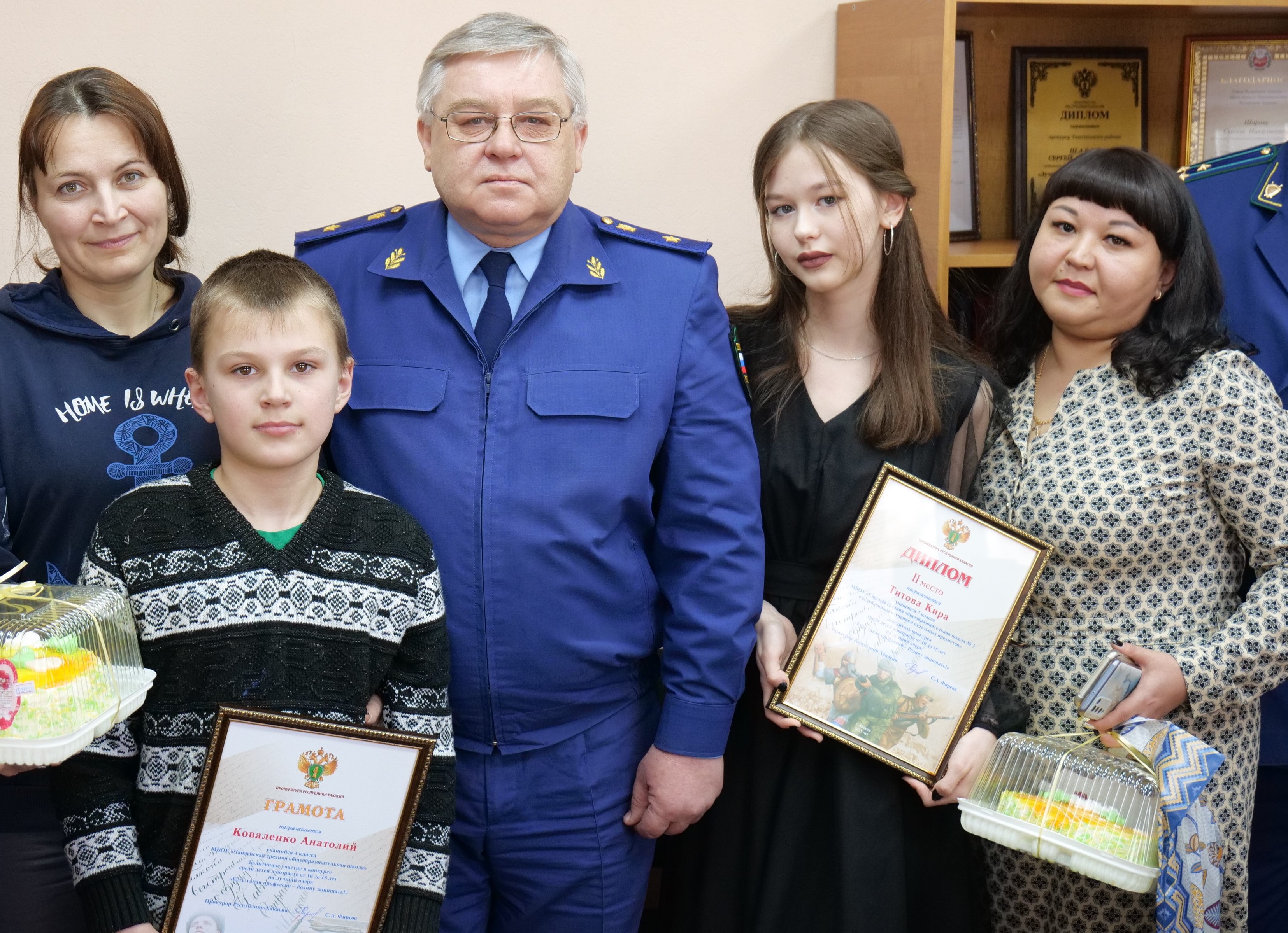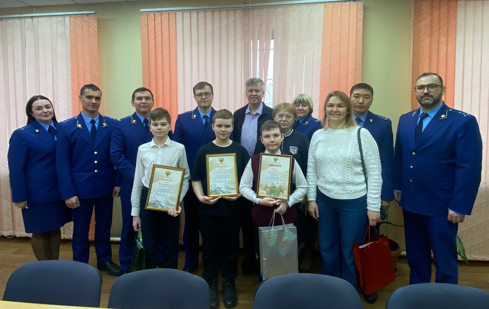 В период с 14 по 20 февраля 2023 г. призеры и участники конкурса, чьи творческие работы отмечены конкурсной комиссией на региональном уровне, в торжественной обстановке награждены дипломами и грамотами в прокуратурах городов и районов республики. Награды ребятам вручали прокурор Республики Хакасия Фирсов Сергей Анатольевич и первый заместитель прокурора республики Мошков Андрей Владиславович.