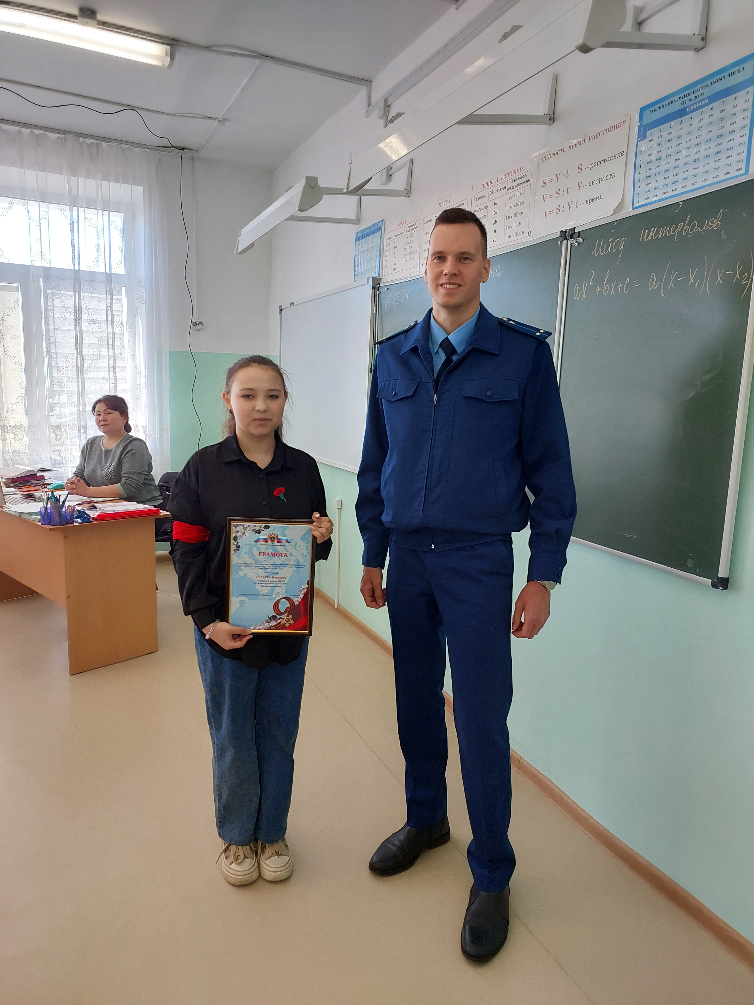 Учащейся МБОУ «Арбатская средняя общеобразовательная школа» Сидоровой Варваре, занявшей второе место в конкурсе, награда сегодня вручена в прокуратуре Таштыпского района заместителем прокурора республики Денисом Стонтом совместно с Уполномоченным по правам ребенка в Республике Хакасия Ириной Ауль.