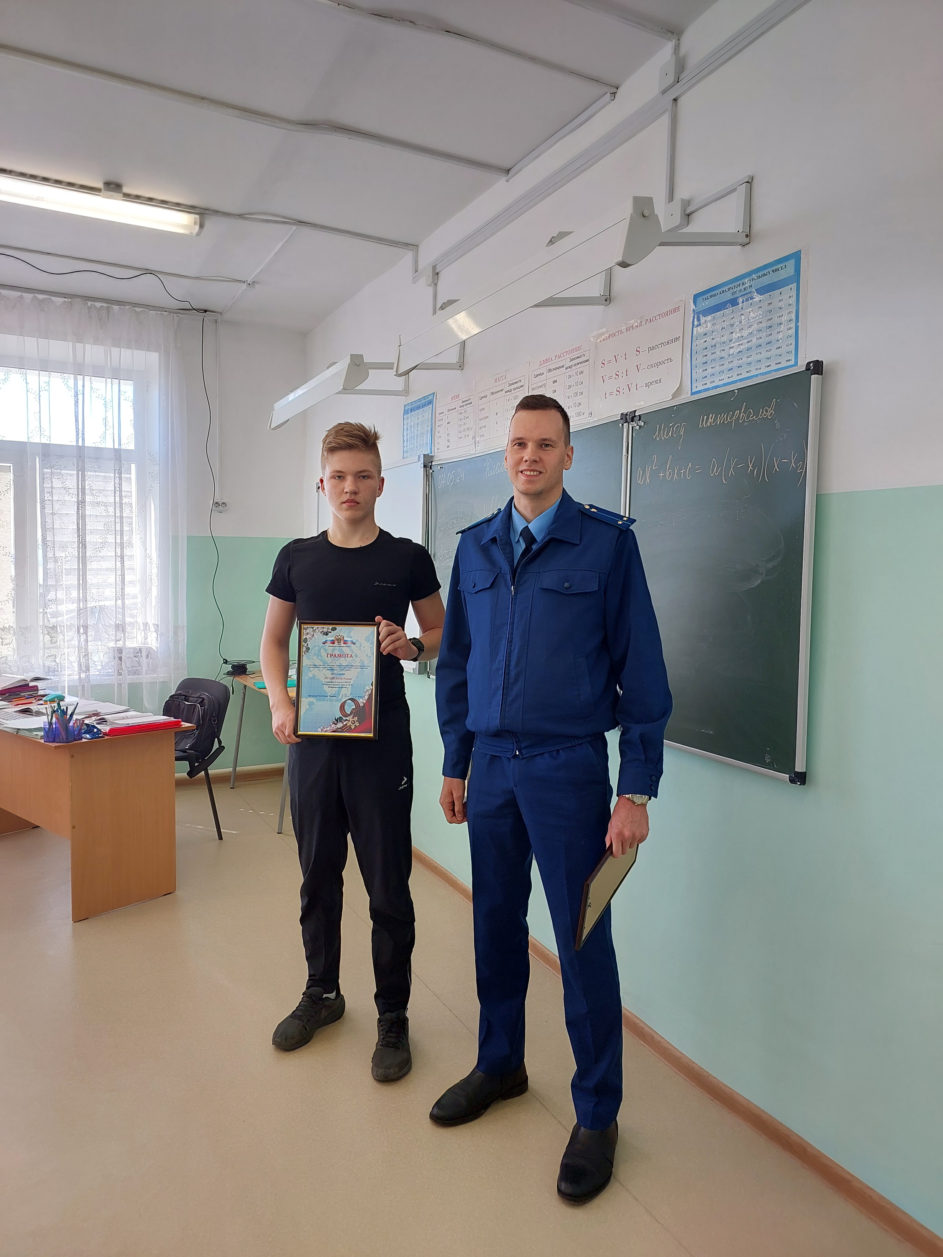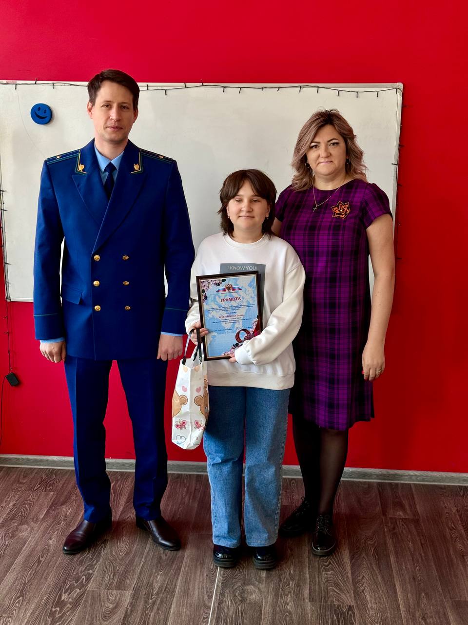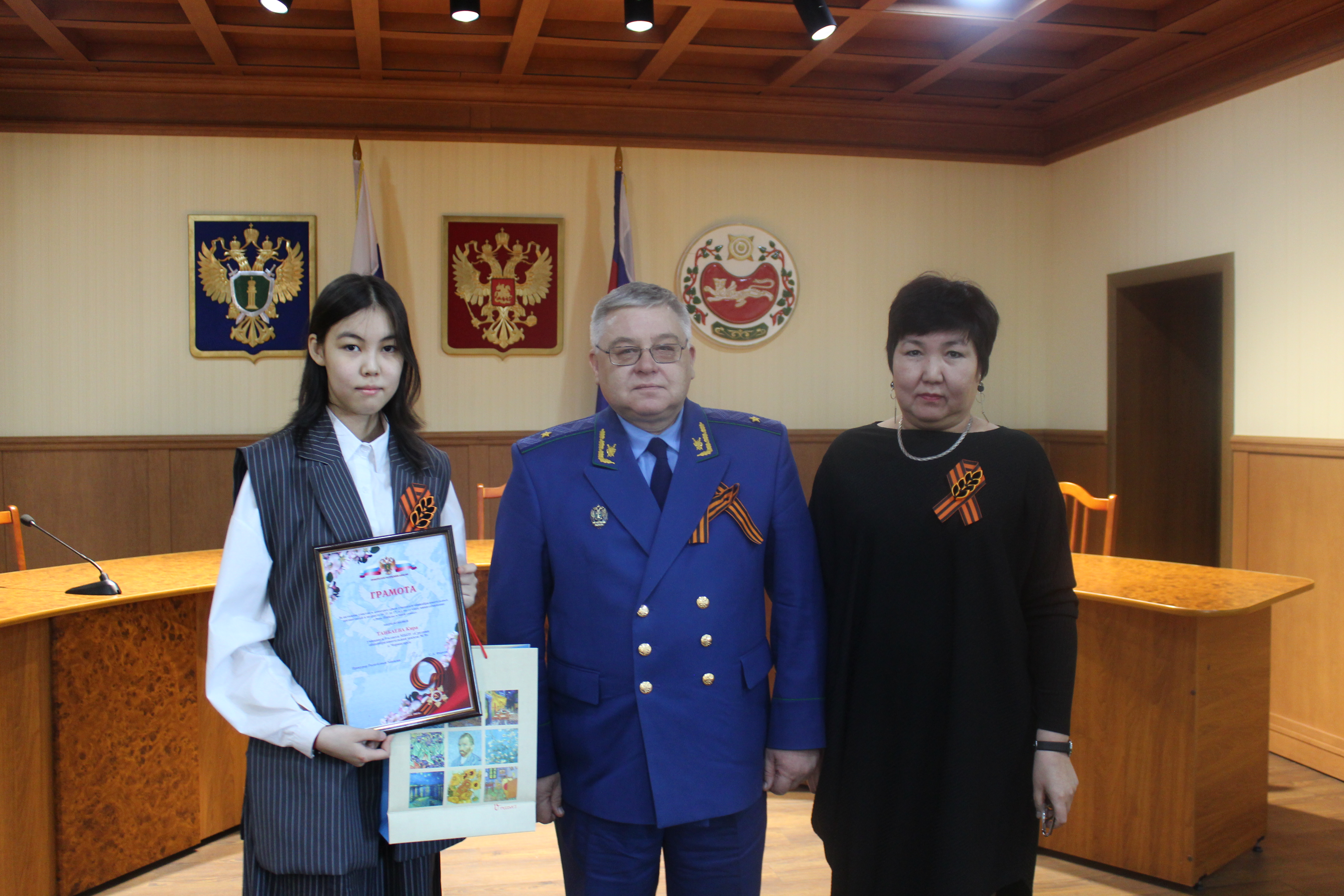 Грамотами прокурора Республики Хакасия отмечены творческие работы учащихся МБОУ «Средняя общеобразовательная школа № 16 им. Д.М. Карбышева» г. Черногорска Арсентьевой Елены, МБОУ «Средняя общеобразовательная школа № 7 им. Героя Советского Союза П.А. Рубанова» Маскаевой Дарьи, МБОУ «Средняя общеобразовательная школа № 9» г. Черногорска Танбаевой Киры, МБОУ «Средняя общеобразовательная школа № 18» г. Абакана Бурнаковой Евы, МБОУ «Средняя общеобразовательная школа № 1 им. 50-летия Красноярскгэсстрой» г. Саяногорска Бочкарево й Оксаны, МБОУ «Бейская средняя общеобразовательная школа-интернат им. Н.П. Князева» Шлокиной Ксении и Опарина Артема, МБОУ «Белоярская средняя школа» Ивакиной Маргариты, МБОУ «Аскизский лицей-интернат им. М.И. Чебодаева» Юнгейм Изабеллы, МБОУ «Боградская средняя общеобразовательная школа» Лубенниковой Полины, МБОУ «Озерная средняя школа № 9» Ширинского района Мухменова Романа и Бугаевой Виктории.