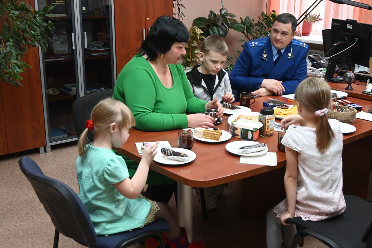 В рамках мероприятия за чашкой чая с детьми пообщались работники прокуратуры, дети рассказали о своих увлечениях. Младшие дети Елизавета и Екатерина любознательные, общительные. Сын Дмитрий посещает школу, в свободное от учебы время любит играть в подвижные игры.
