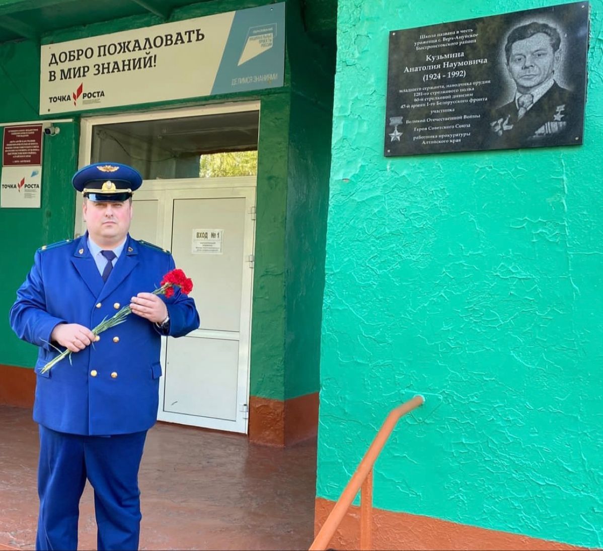 Коллективом прокуратуры Быстроистокского района в преддверии Дня Победы в селе Верх-Ануйском возложены цветы к памятной табличке, открытой в честь Героя Советского Союза Кузьмина Анатолия Наумовича