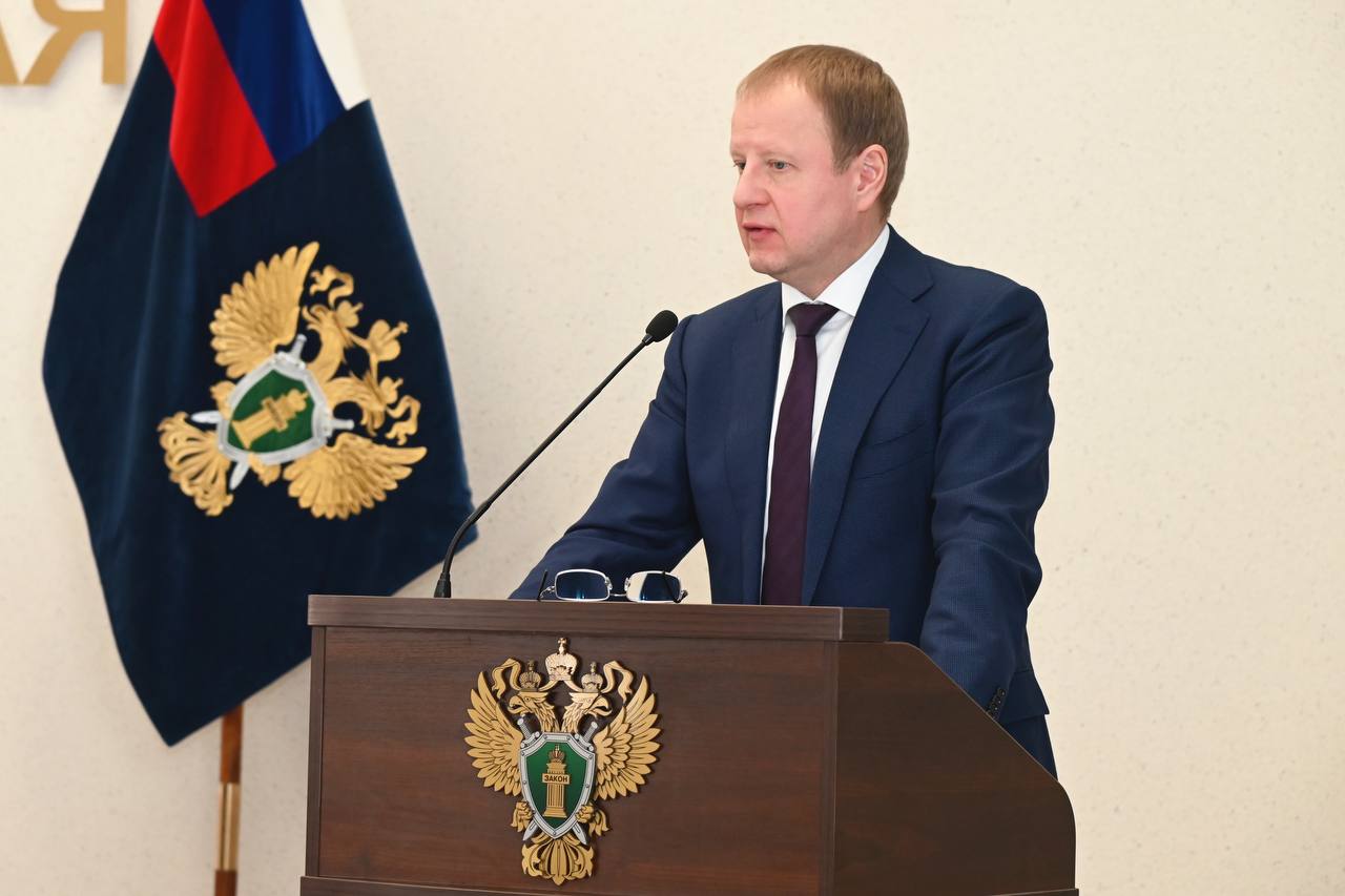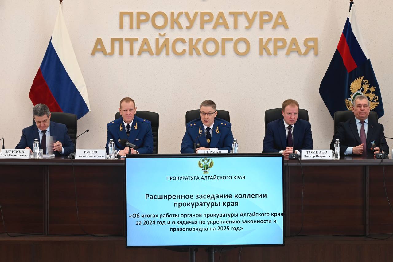 В работе коллегии приняли участие прокурор региона Антон Герман, губернатор края Виктор Томенко, председатель регионального Законодательного Собрания Александр Романенко, Главный федеральный инспектор по Алтайскому краю Юрий Земский, руководители судебных и правоохранительных органов.
