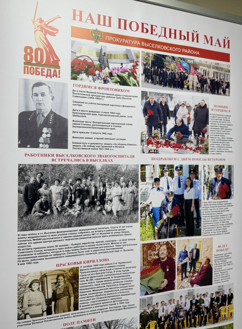 В экспозиции представлена информация и фотоматериалы, посвященные ветерану Великой Отечественной войны - Орба Василию Савельевичу, который был призван на фронт 05.08.1942, прошел всю войну, в том числе в Белореченском партизанском отряде имени Сталина и после окончания войны, вернулся на должность следователя Выселковскойпрокуратуры. В музейной экспозиции представлены награды ветеранов прокуратуры Выселковского района.