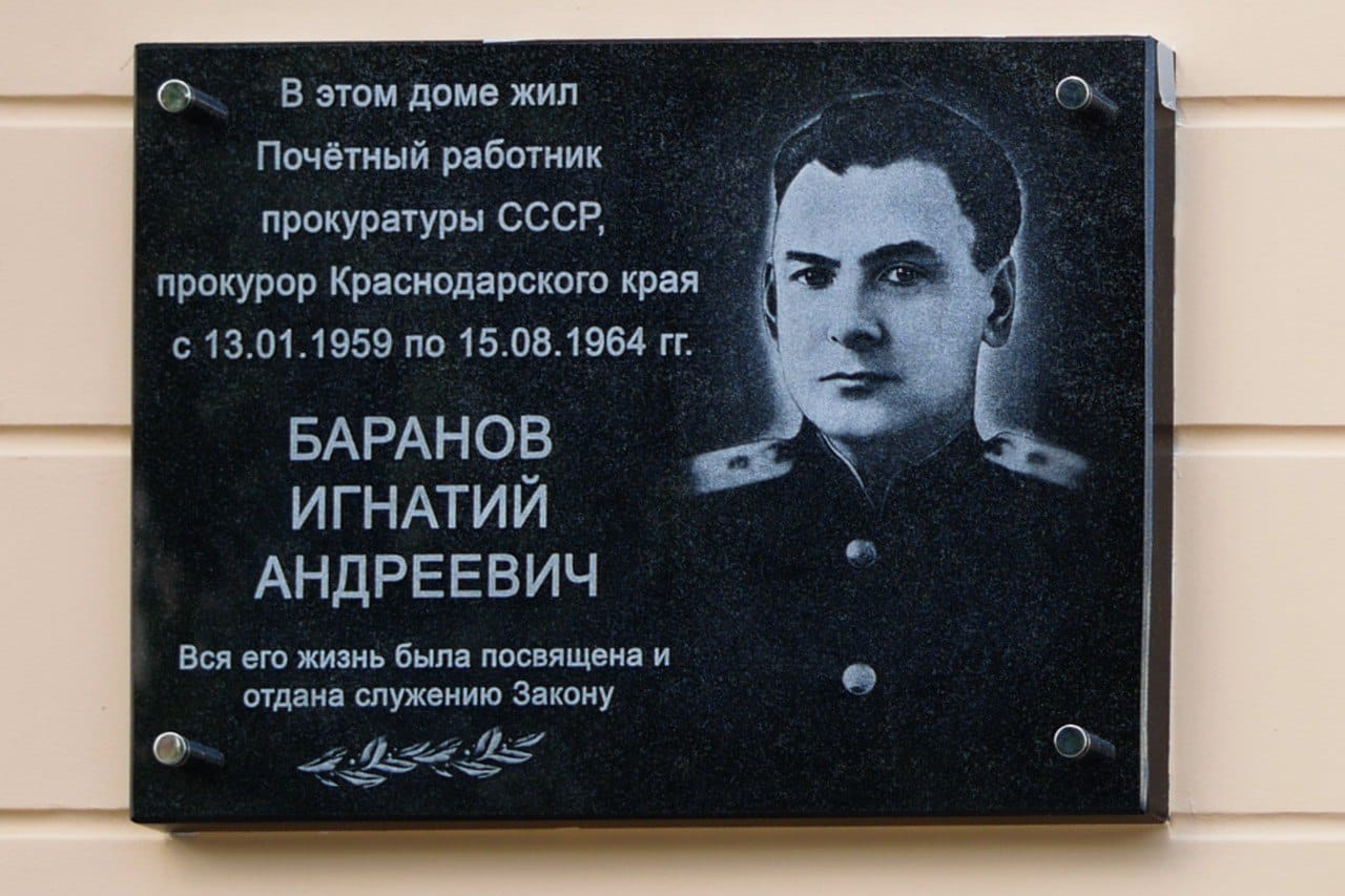 Мемориальная доска, посвященная памяти ветерана прокуратуры края, Почетного работника прокуратуры, Игнатия Андреевича Баранова (14 февраля 1907 года – 19 июля 1983 года), расположена на улице Советской, 60 города Краснодара. Её открыли в сороковую годовщину его ухода из жизни на доме, в котором он жил.