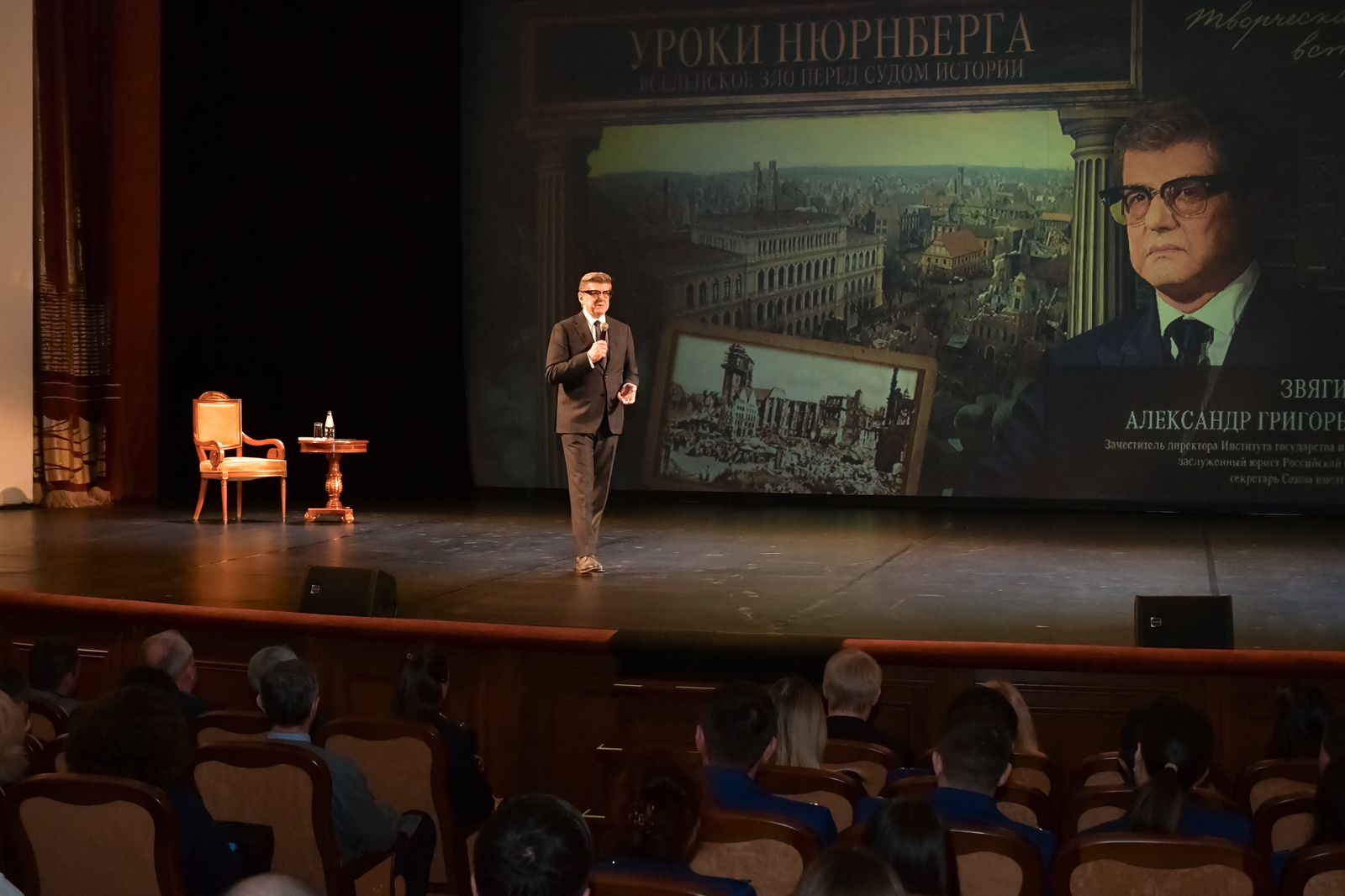 В Зимнем театре г. Сочи состоялась творческая встреча «Уроки Нюрнберга. Вселенское зло перед судом истории» с заместителем директора Института государства и права РАН, заслуженным юристом Российской Федерации, секретарем Союза писателей России – Александром Григорьевичем Звягинцевым. В мероприятии приняли участие порядка 1 тысячи слушателей.
