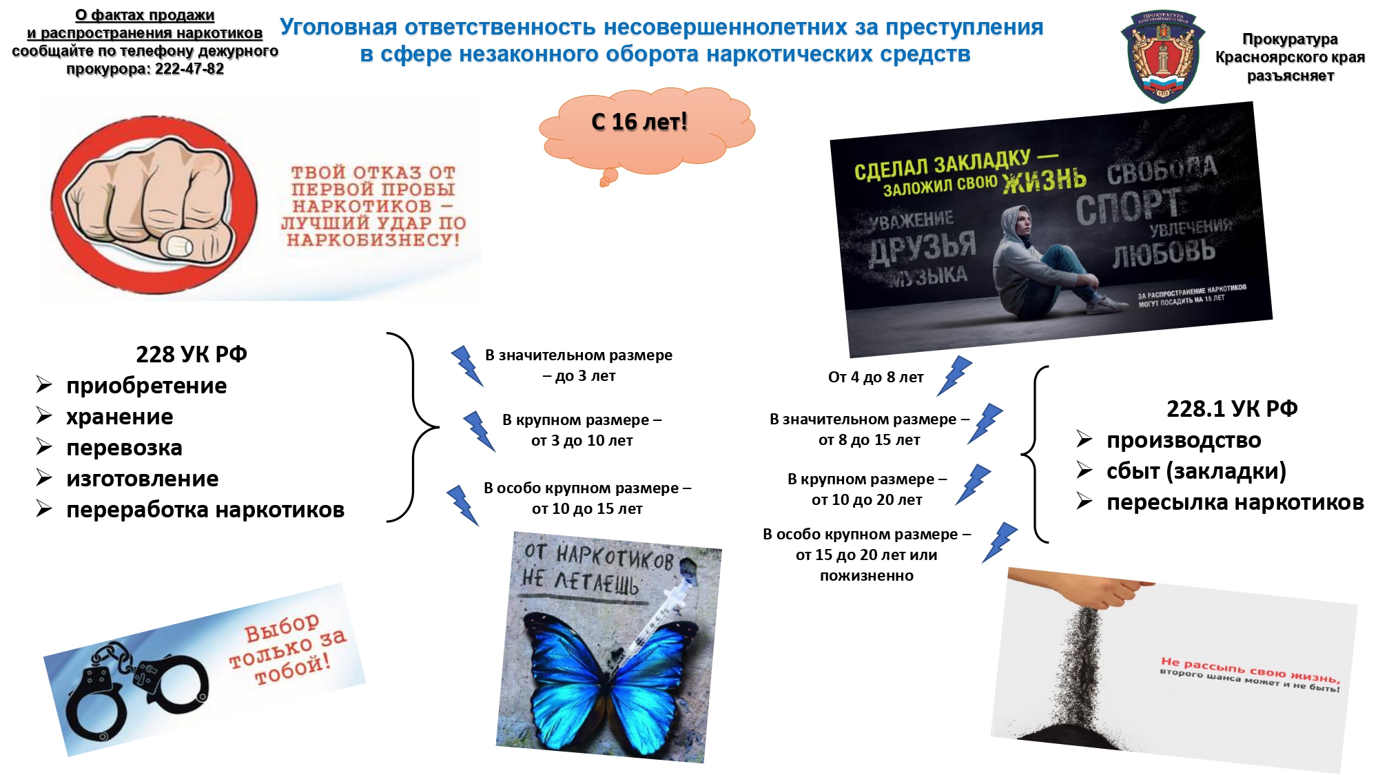 Прокуратурой Красноярского края подготовлена и распространена листовка об уголовной ответственности несовершеннолетних за преступления, совершенные в сфере незаконного оборота наркотических средств, в которой названы статьи уголовного кодекса и меры наказания, котороые могут быть применены к несовершеннолетним за такие противоправные деяния.