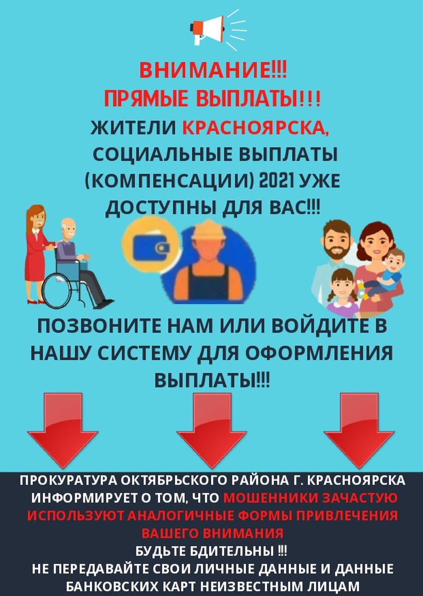 Прокуратурой Октябрьского района г. Красноярска подготовлена листовка, в которой гражданам предлагается не поддаваться уловкам мошенников, использующих всевозможные формы привлечения внимания населения, призывающих позвонить на какой-либо телефон либо заполнить свои персональные данные в какой-либо системе для получения социальных выплат. Никогда не сообщайте свои личные данные и данные банковских карт неизвестным лицам!