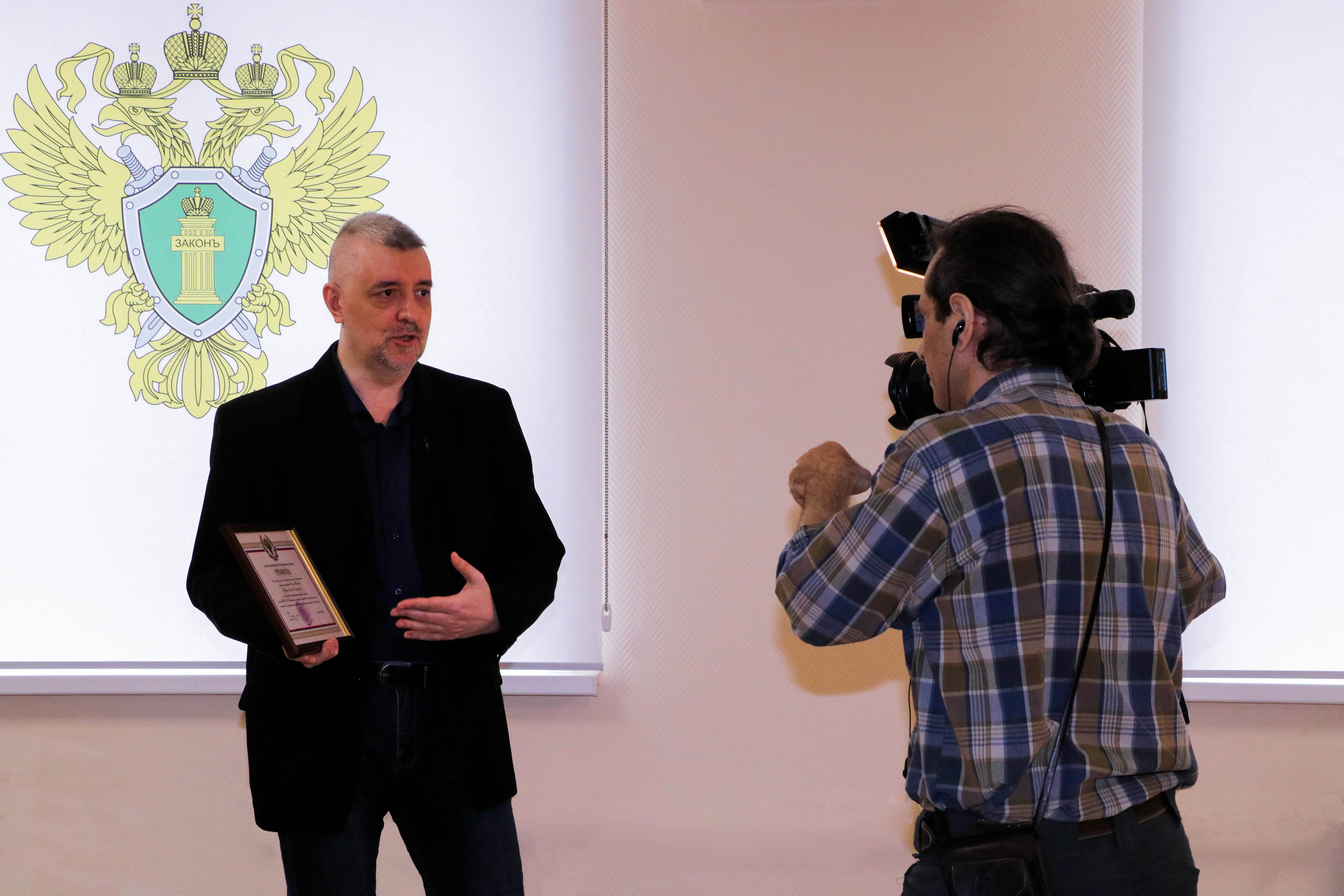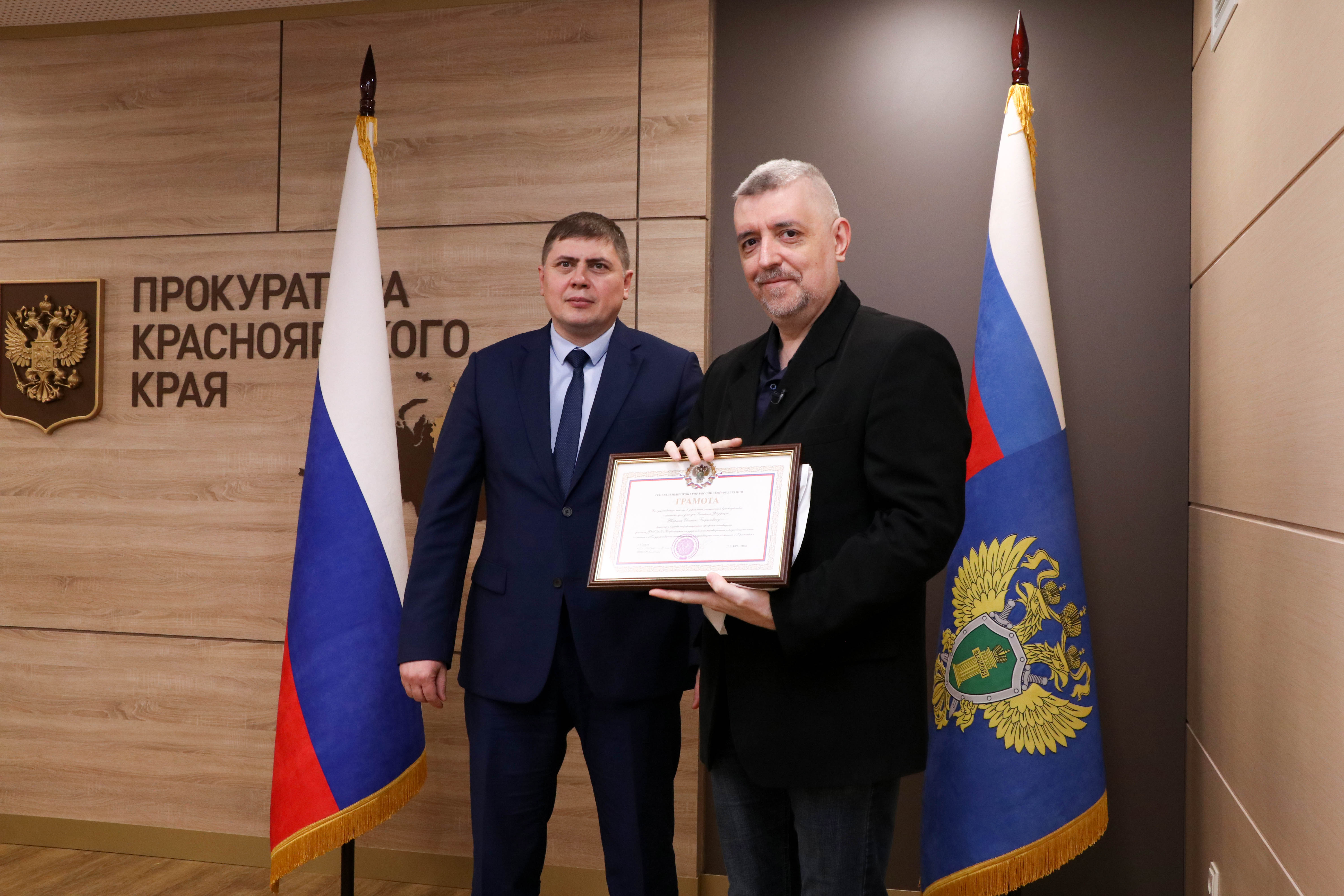 Сегодня прокурор края Роман Тютюник в торжественной обстановке вручил режиссеру филиала ВГТРК «ГТРК «Красноярск» Евгению Жарких грамоту Генерального прокурора Российской Федерации