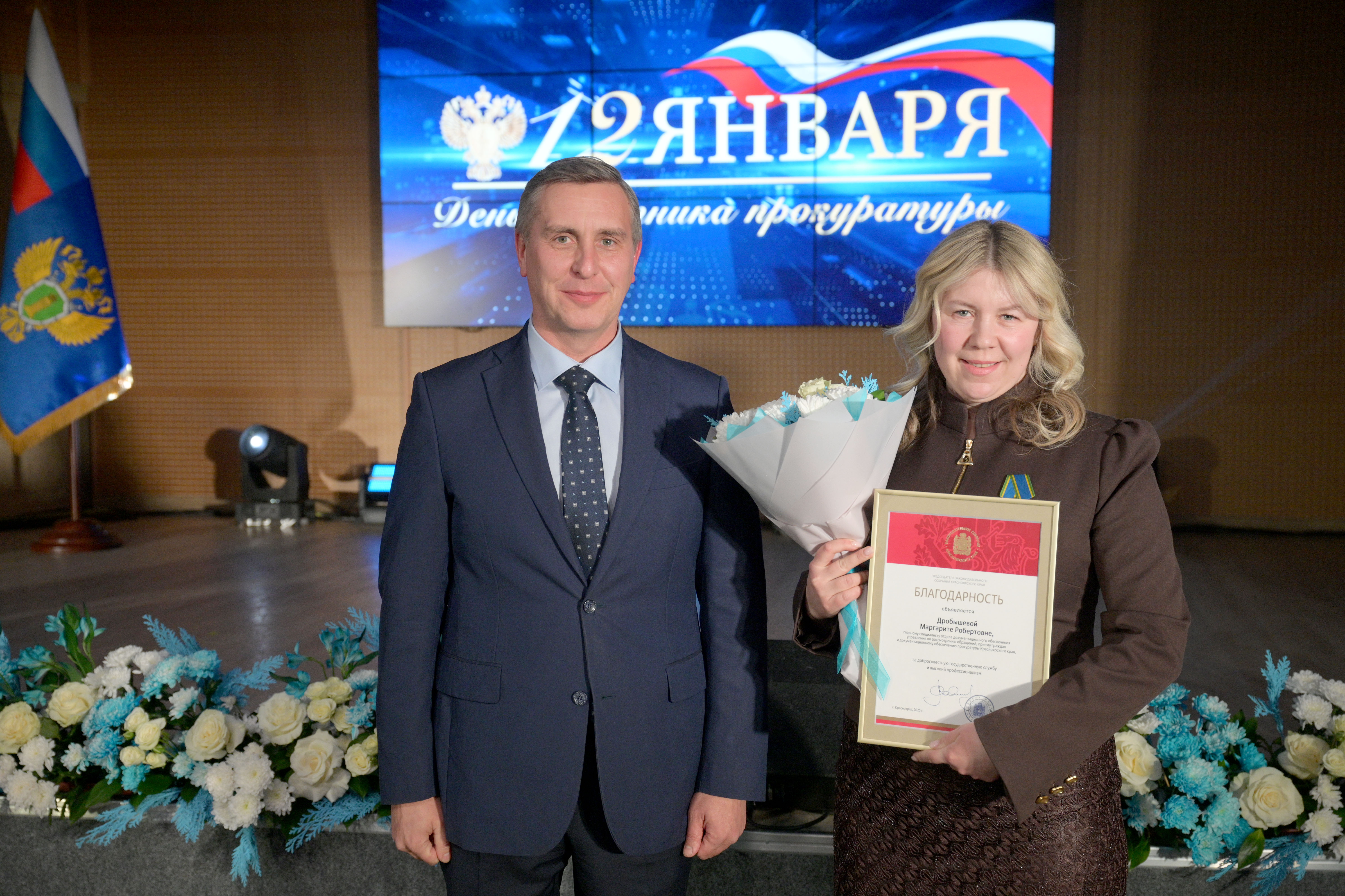 Мероприятие открыл прокурор Красноярского края Роман Тютюник. Он поздравил сотрудников и ветеранов прокуратуры с профессиональным праздником и поблагодарил за проделанную работу. В торжественной обстановке Роман Тютюник вручил награды Генерального прокурора России 33 сотрудникам и ветеранам за примерное исполнение служебных обязанностей, заслуги в деле укрепления законности и правопорядка. Отличившиеся работники также поощрены Губернатором края, председателем Законодательного Собрания края. Прокурор края вручил благодарственные письма родителям прокурорских работников за достойное воспитание сыновей и дочерей.