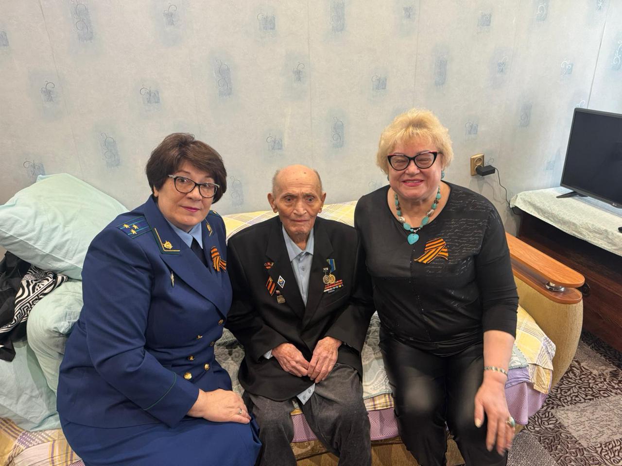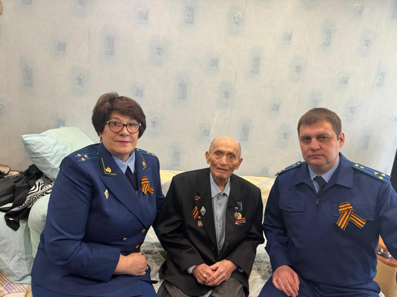 В преддверии празднования Дня Победы старшие помощники прокурора Хабаровского края Елена Хохлова, Павел Колушкин и председатель Совета ветеранов прокуратуры Хабаровского края Надежда Батрак поздравили участника Великой Отечественной войны