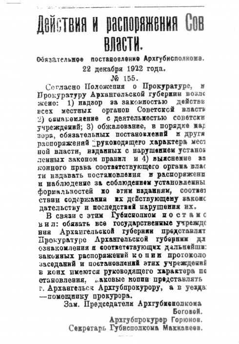 В связи с этим Архгубисполком постановлением от 22 декабря 1922 года обязал все государственные учреждения губернии представлять прокуратуре копии протоколов заседаний и постановлений «руководящего характера».