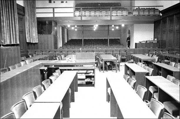 Общий вид зала заседаний Международного военного трибунала во Дворце юстиции, где проходил Нюрнбергский процесс.