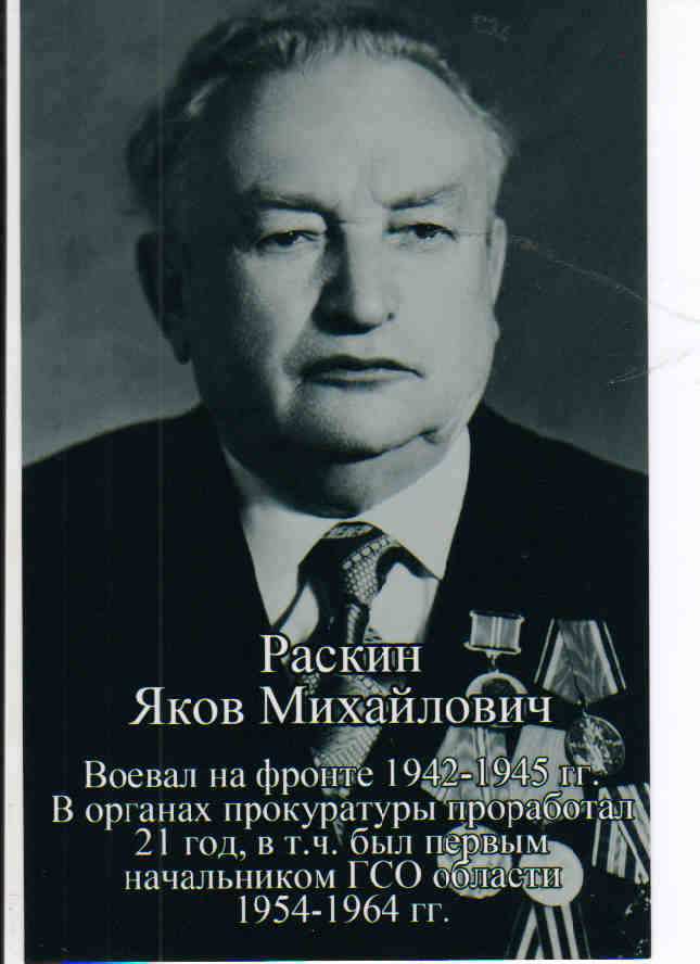 После снятия блокады в сентябре 1943 года Раскин Я.М. направлен на работу в Курскую область на должность начальника гражданско-судебного отдела прокуратуры Курской области, а с июля 1948 года – на должность прокурора Еврейской автономной области Хабаровского края, с февраля 1950 года назначен начальником гражданско-судебного отдела прокуратуры Омской области. В 1954 году направлен во вновь образованную Белгородскую область на должность начальника гражданско-судебного отдела прокуратуры области. В этой должности работал до ухода на пенсию.