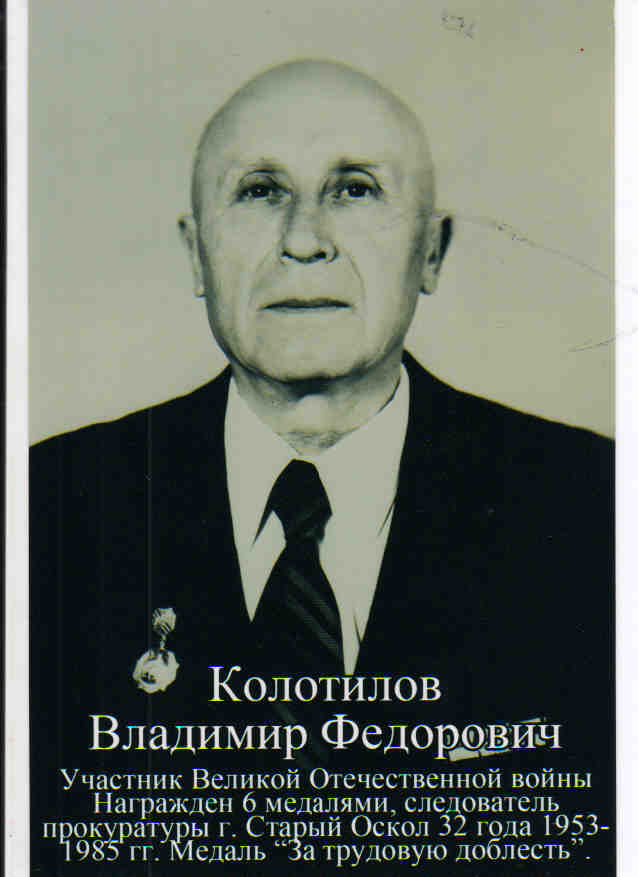 «С именем Владимира Федоровича Колотилова неразрывно связаны такие понятия, как долг, верность и беззаветное служение Закону и Отечеству. Владимир Федорович – участник Великой Отечественной войны. После окончания войны возвратился домой и по направлению местного военкомата уехал на 6-месячные курсы, успешно окончил их и, получив специальность следователя прокуратуры, был направлен в Курскую областную прокуратуру, потом на работу в прокуратуру г. Старый Оскол в качестве следователя, в которой проработал до выхода в отставку на пенсию. В 1972 году меня назначили стажером Старооскольской межрайонной прокуратуры, где я познакомился с Владимиром Федоровичем. К тому времени он был самым опытным следователем, особенно по расследованию умышленных убийств и других преступлений против личности.