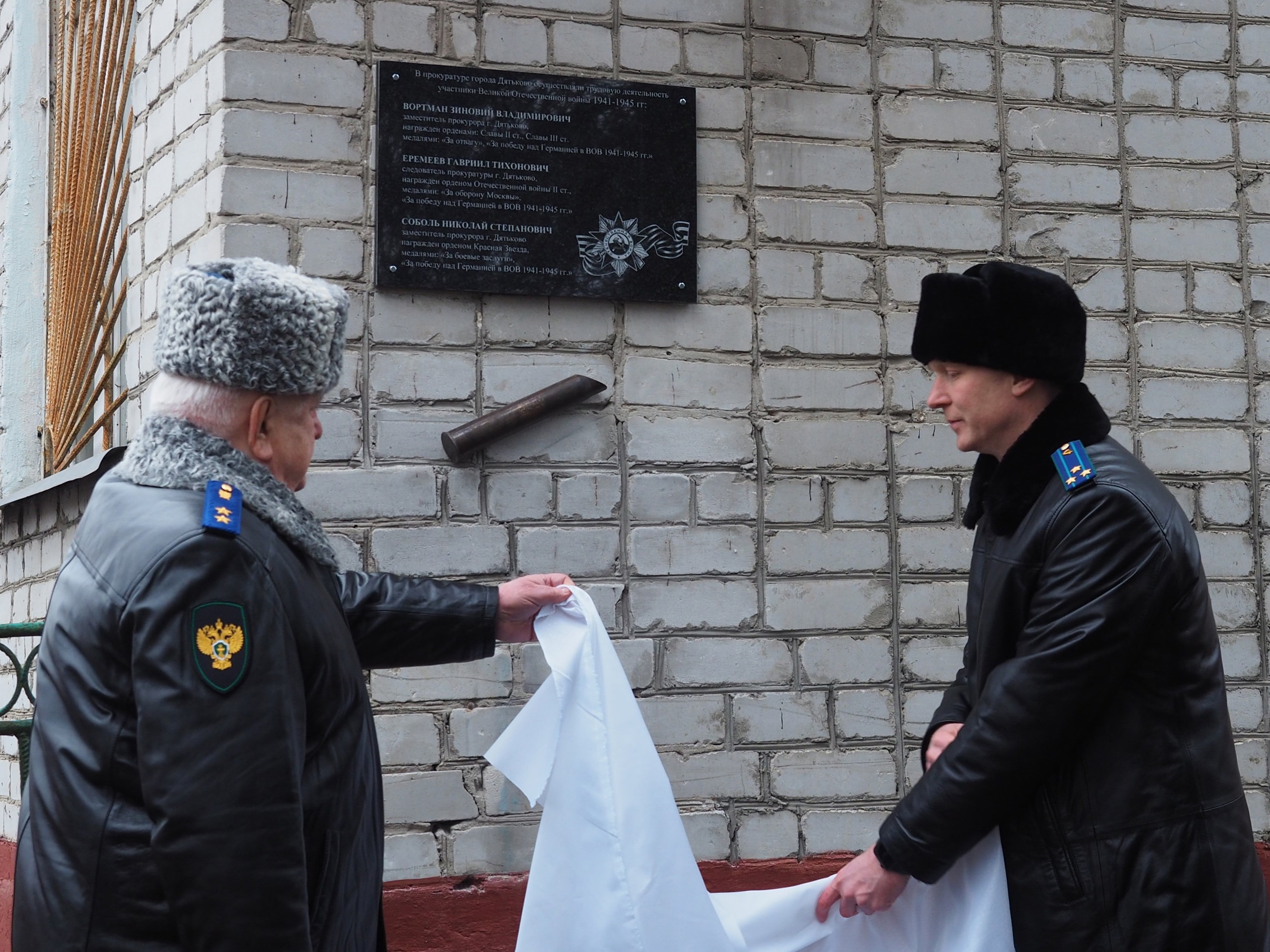 Сегодня, 4 марта 2025 года, в Дятьково по инициативе прокурора города Александра Пасечника в торжественной обстановке состоялось открытие мемориальной доски на здании прокуратуры. Она посвящена памяти работников надзорного ведомства, которые воевали на полях сражений Великой Отечественной войны. На ней имена трех фронтовиков: Гавриила Тихоновича Еремеева, Зиновия Владимировича Вортмана и Николая Степановича Соболя.