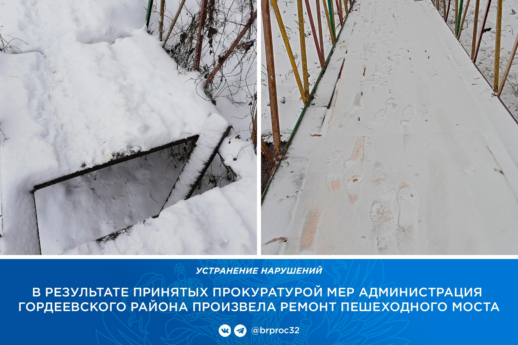 Прокуратурой Гордеевского района проведена проверка информации, опубликованной в сообществе «Подслушано Гордеевка» в социальной сети «Вконтакте» о ненадлежащем состоянии пешеходного моста, расположенного вблизи озера Центральное с. Гордеевка.