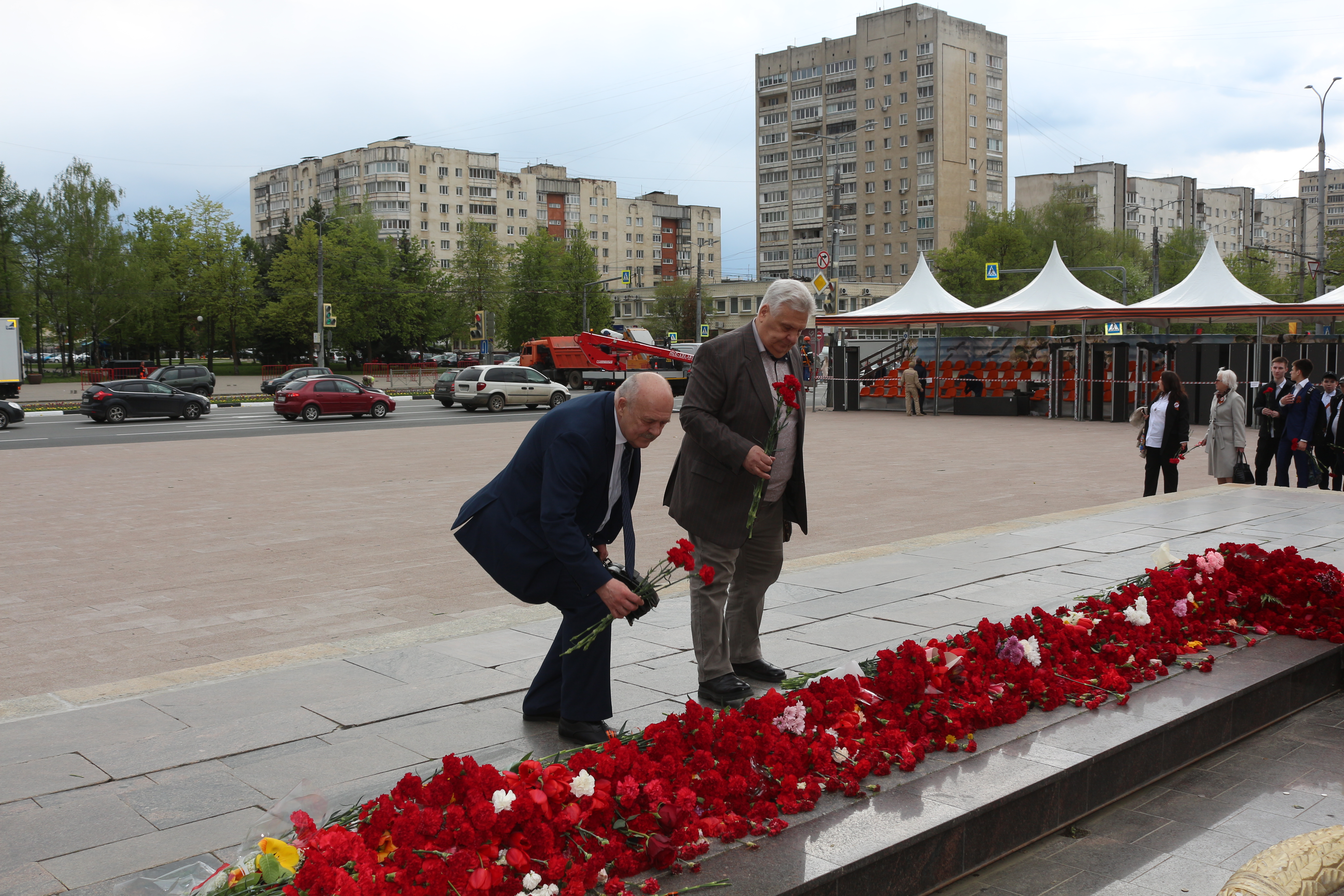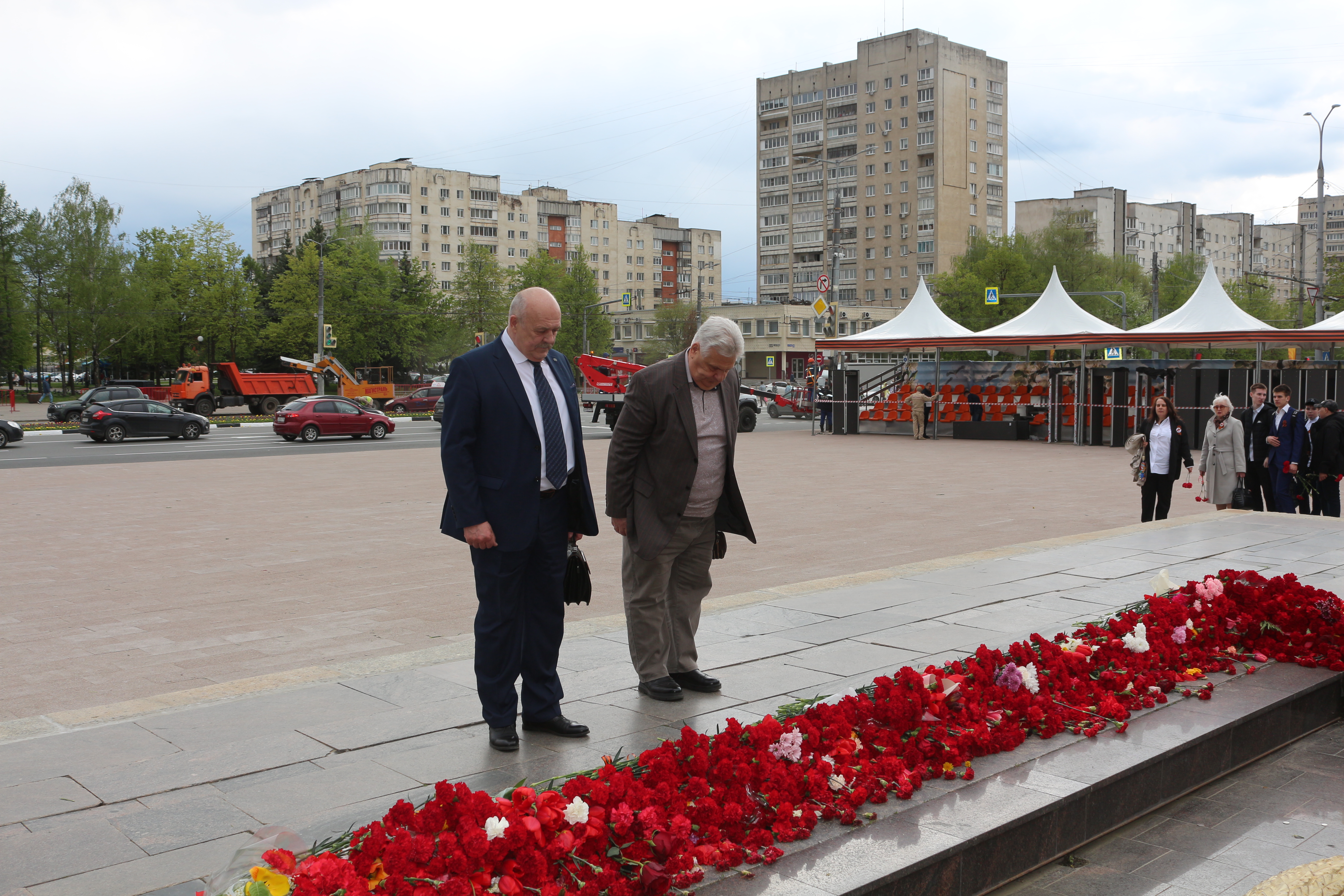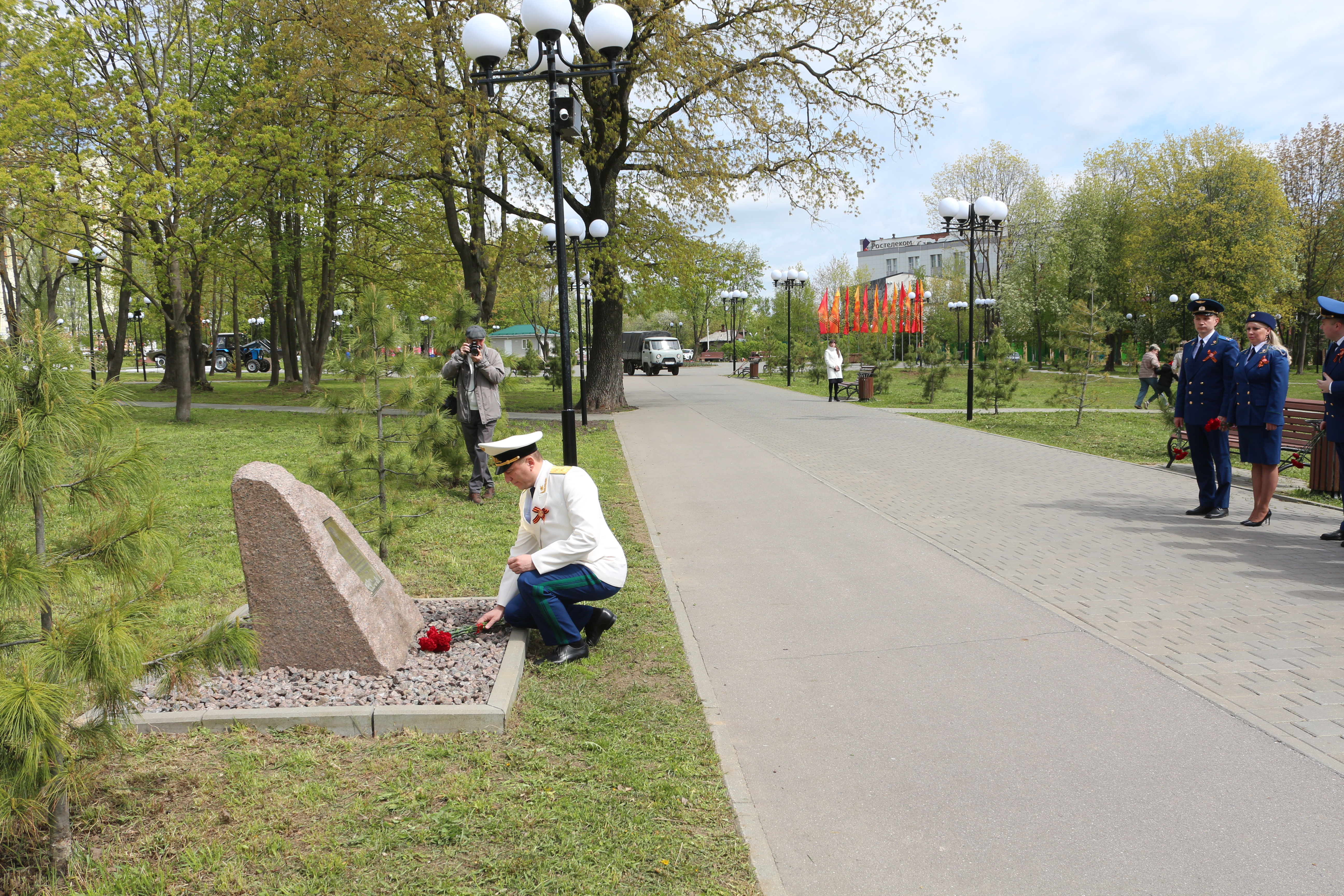Ветераны первыми возложили цветы к мемориальной доске и к мемориальному камню в военно-патриотическом сквере на пересечении улицы Мира и Октябрьского проспекта.