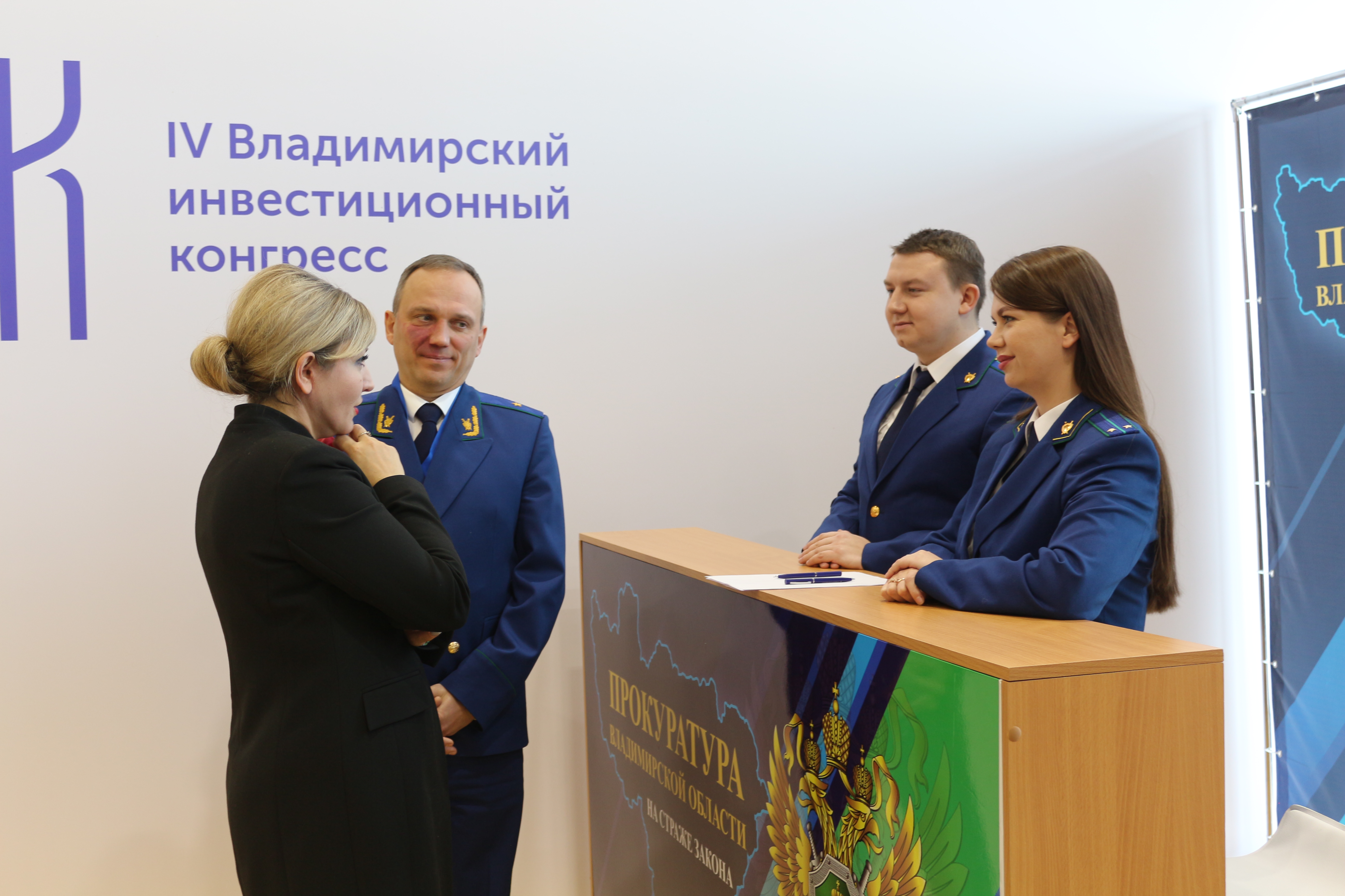 Следует отметить, что на площадке конгресса работал стенд прокуратуры Владимирской области, где представители бизнес-сообщества могли получить ответы на интересующие их вопросы, связанные с правоприменительной практикой, а также оставить официальные обращения.