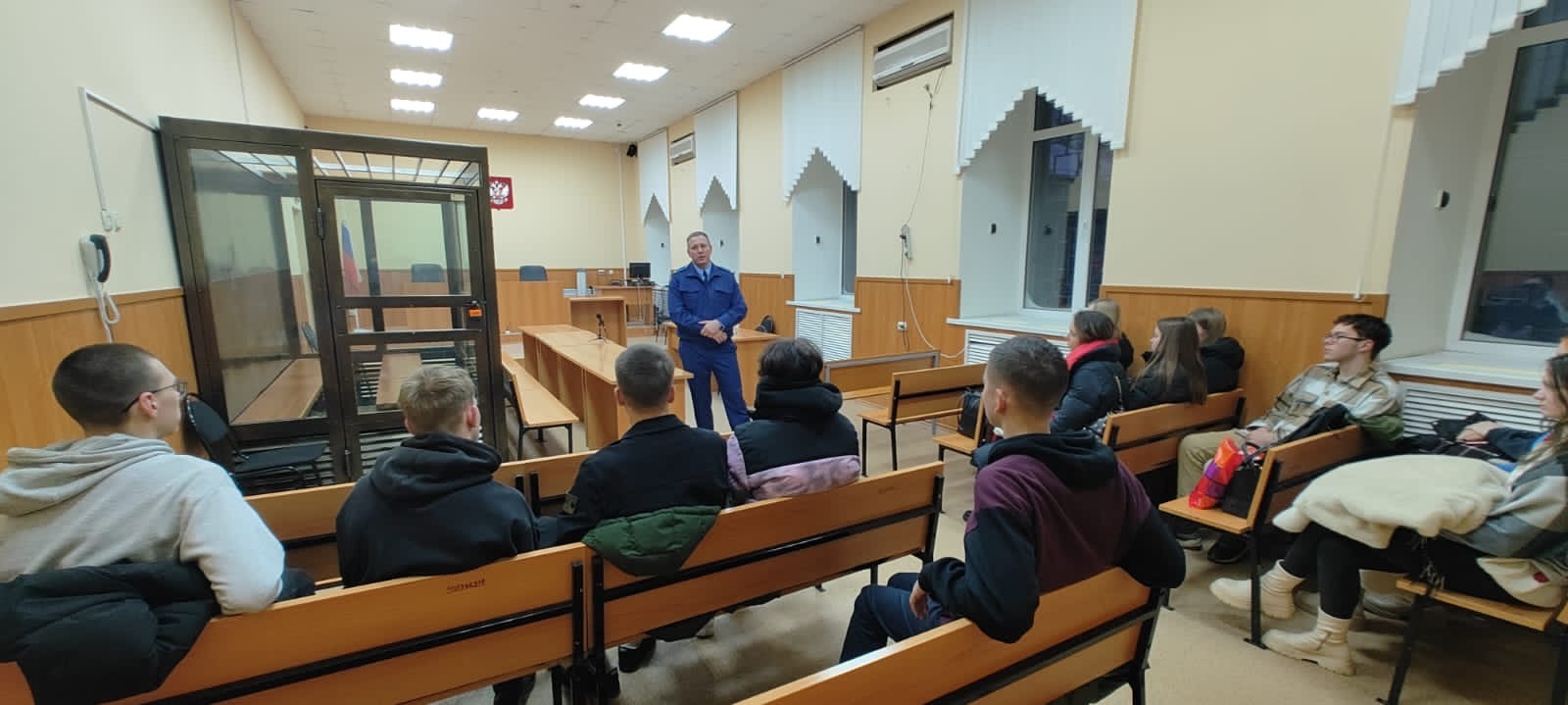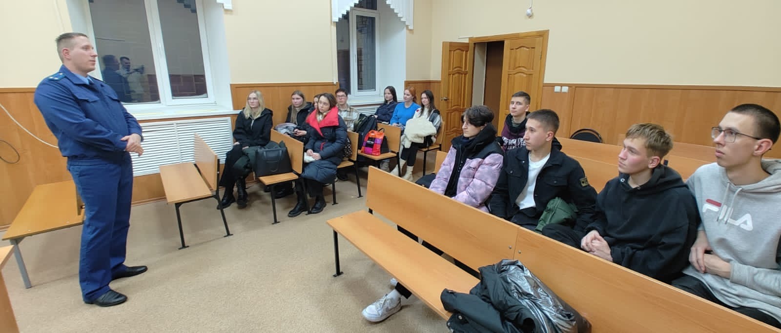 В рамках реализации мероприятий по правовому просвещению заместитель прокурора города Сергей Лаврентьев вместе со студентами Владимирского юридического института ФСИН России посетили Ленинский районный суд г. Владимира и приняли участие в качестве слушателей при рассмотрении уголовного дела о тяжком преступлении против собственности.