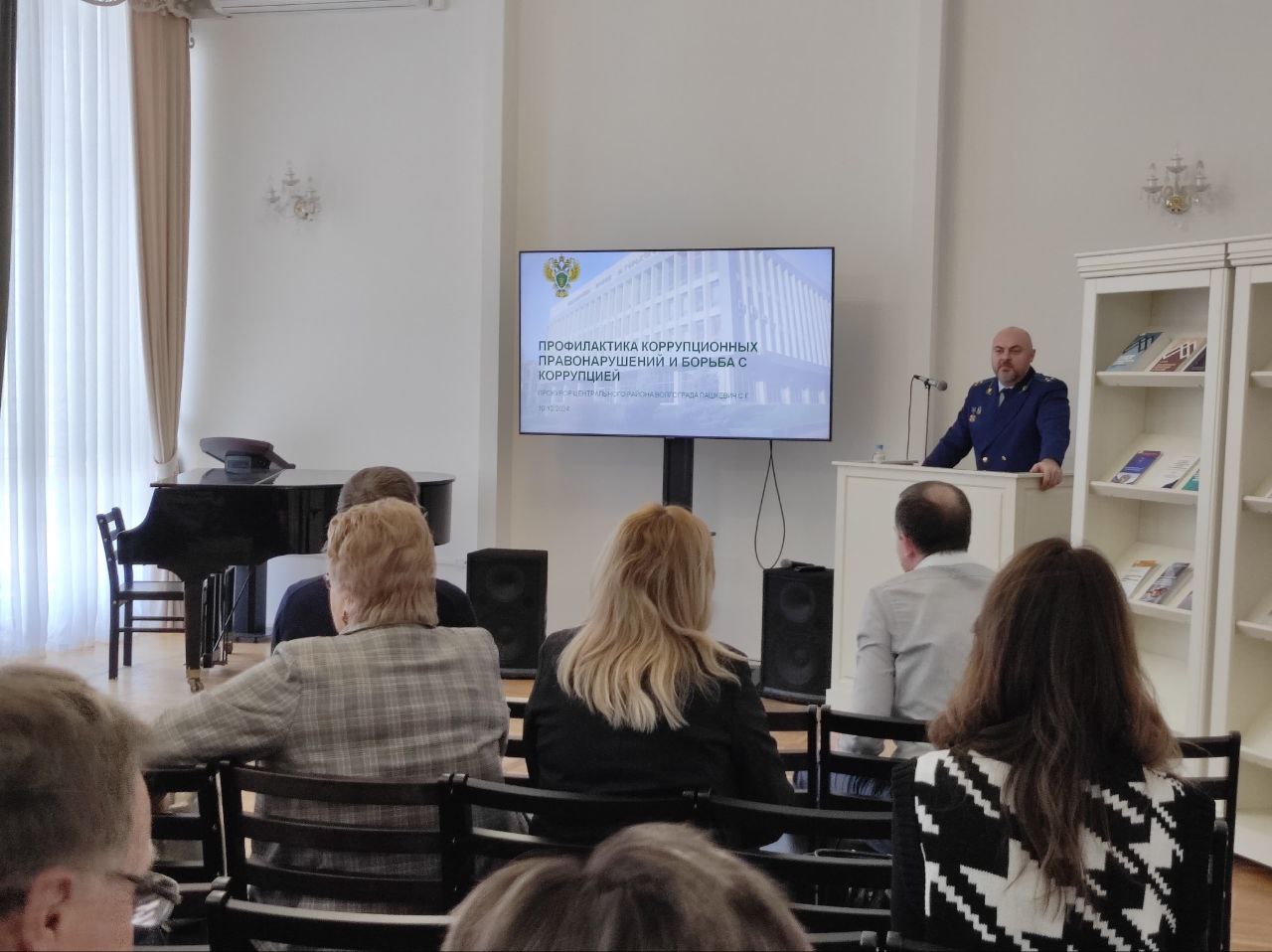 В актовом зале главной библиотеки региона прокурор рассказал представителям учреждений культуры Волгоградской области о принимаемых мерах по борьбе с коррупцией, разъяснил нормы антикоррупционного законодательства.