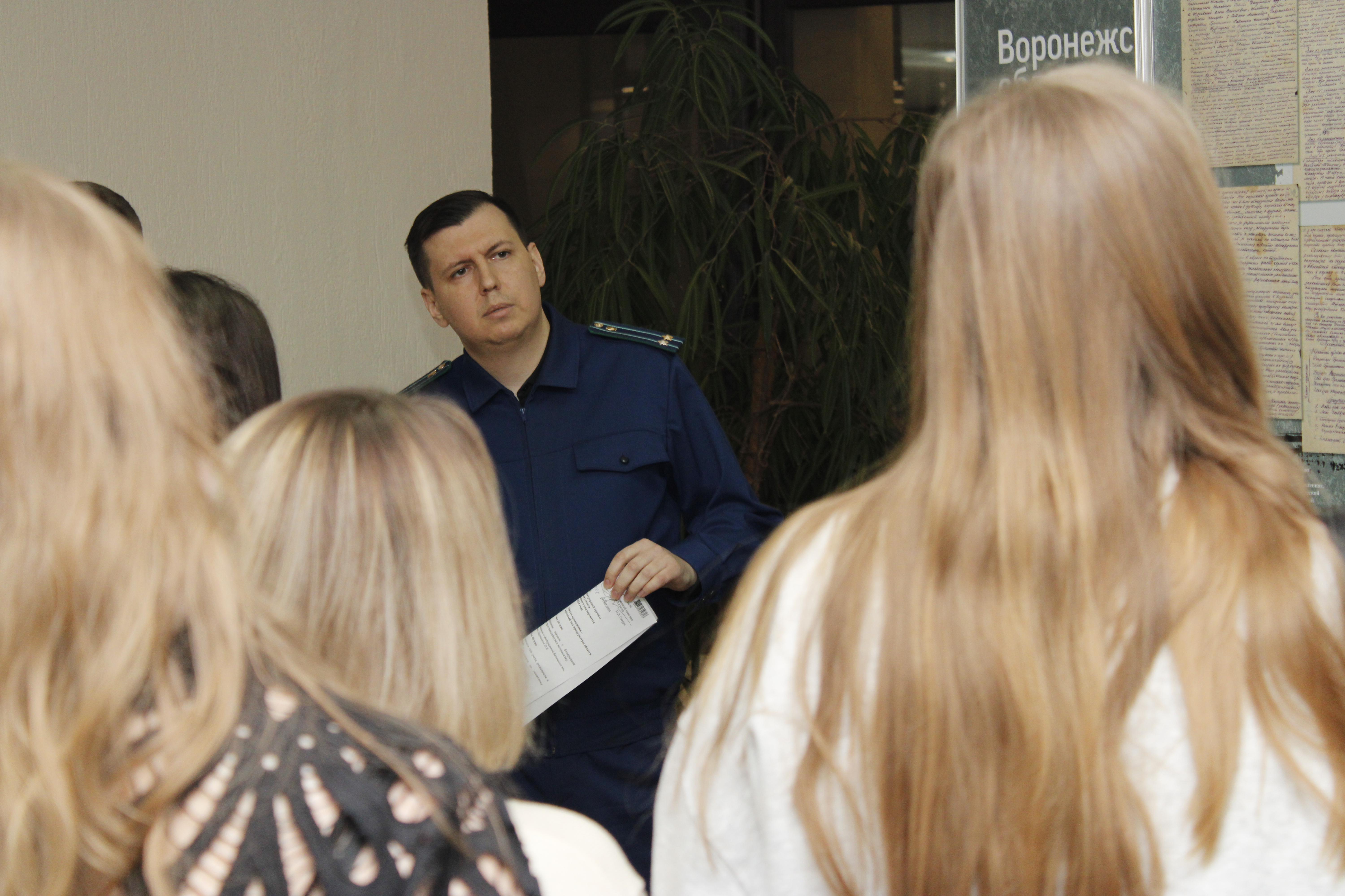 Представителем прокуратуры области проведена встреча со студентами юридического факультета Воронежского государственного университета, в ходе которой до их сведения доведены основы осуществления прокурорского надзора за исполнением законодательства о федеральной безопасности, межнациональных отношениях, противодействии экстремизму и терроризму.