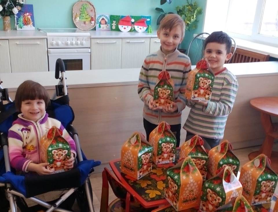 Детям передали сладкие подарки и спортивный инвентарь.