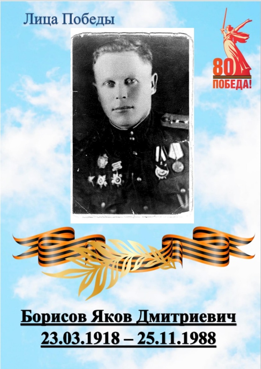 Несмотря на тяжелые ранения, полученные в боях, Борисов Я.Д. прошел всю войну до самой Победы. В конце войны он командовал ротой, участвовал в операции в Восточной Пруссии. Там, в районе г. Кёнигсберга он и встретил май 1945 года. В семье сохранилось фото, сделанное в 1945 году сразу после Победы.