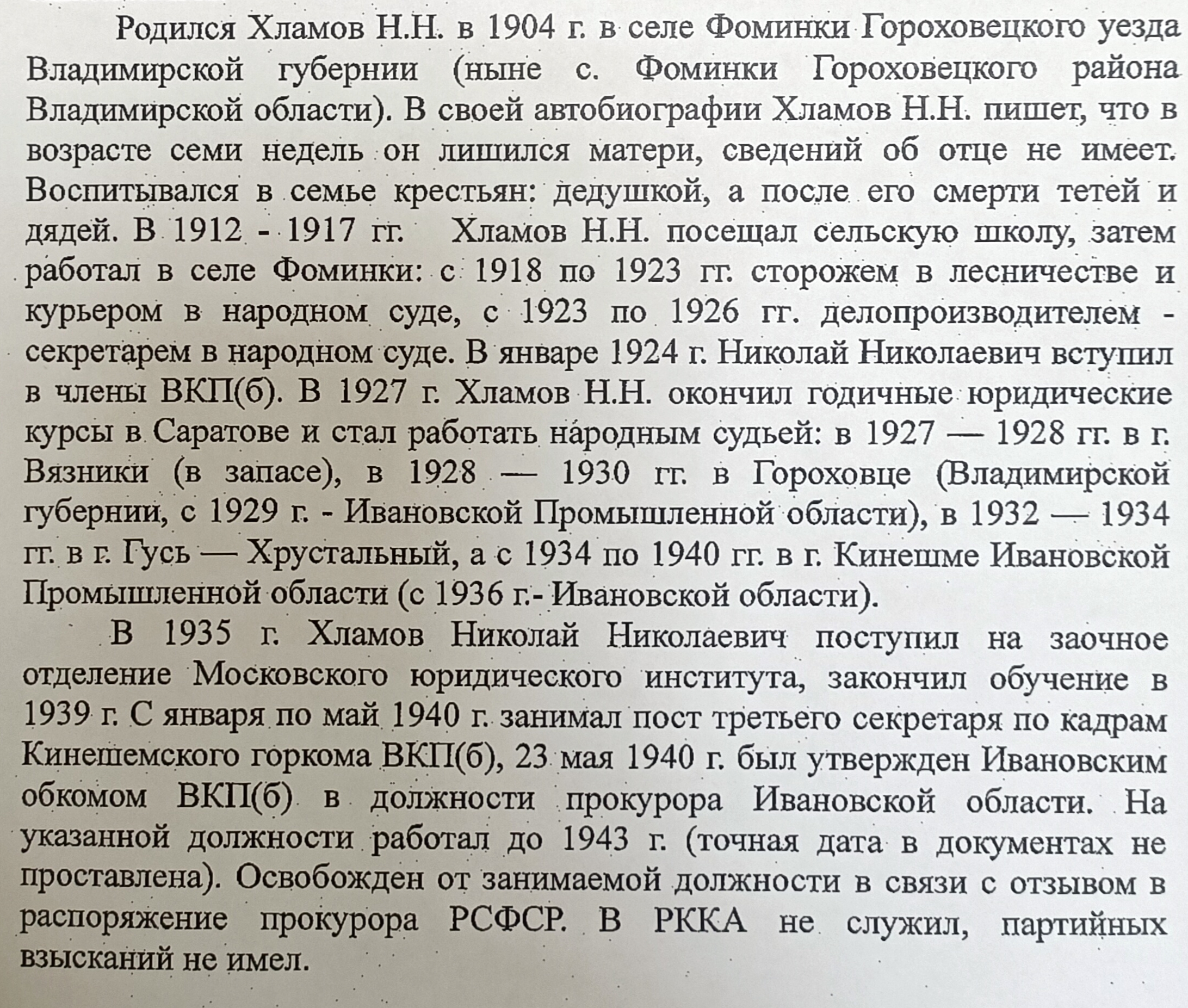 В то время прокурором Ивановской области был Николай Николаевич Хламов. Имея высшее юридическое образование, он отличался грамотностью и инициативностью. Он определил основные направления деятельности прокуратуры в условиях военного времени: надзор за соблюдением трудовой дисциплины на предприятиях, за мобилизацией трудоспособного населения на производство, за выполнением предприятиями спецзаказов для фронта, борьба с растратами, хищениями, спекуляцией, дезертирством.