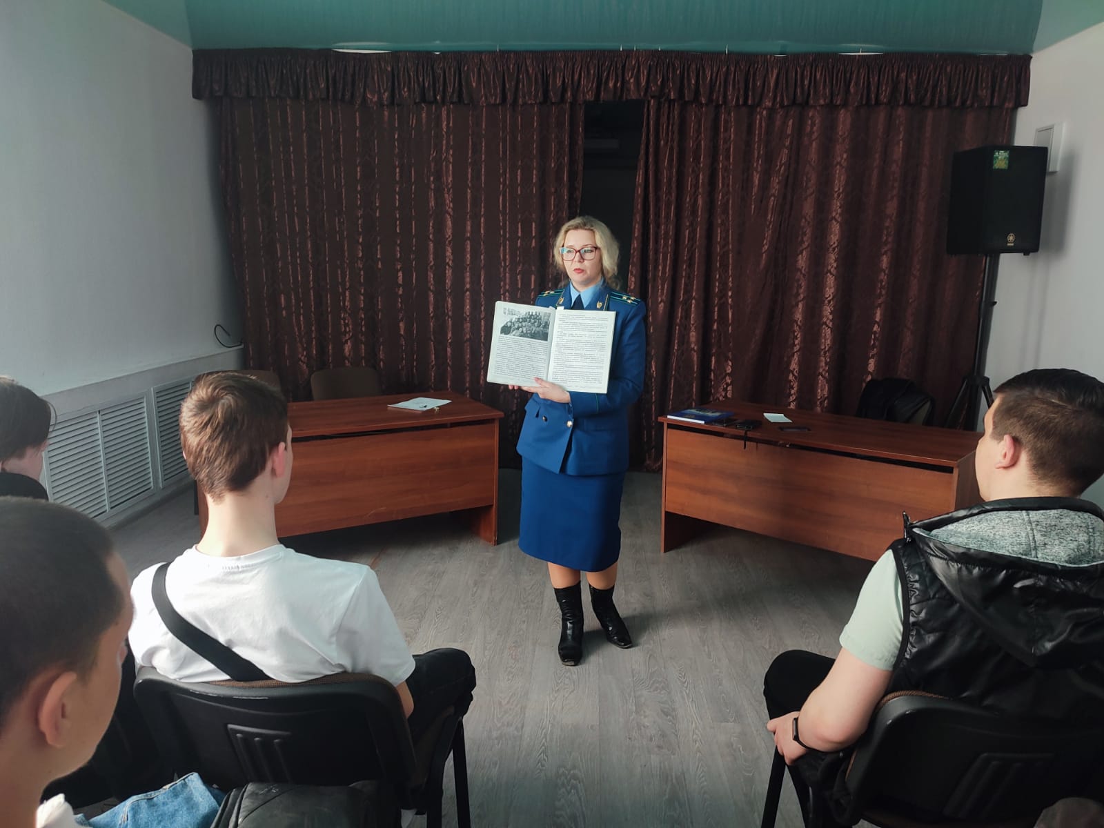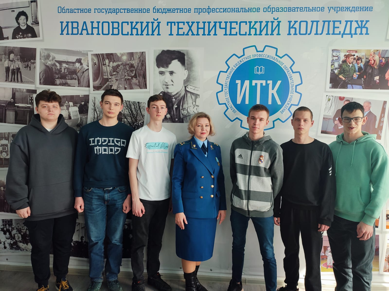 Член совета ветеранов и пенсионеров прокуратуры Ивановской области старший советник юстиции Валентина Владимировна Кручинина приняла участие в гражданско-патриотическом мероприятии «По букве закона», проводившемся для студентов 1 курса Ивановского технического колледжа.