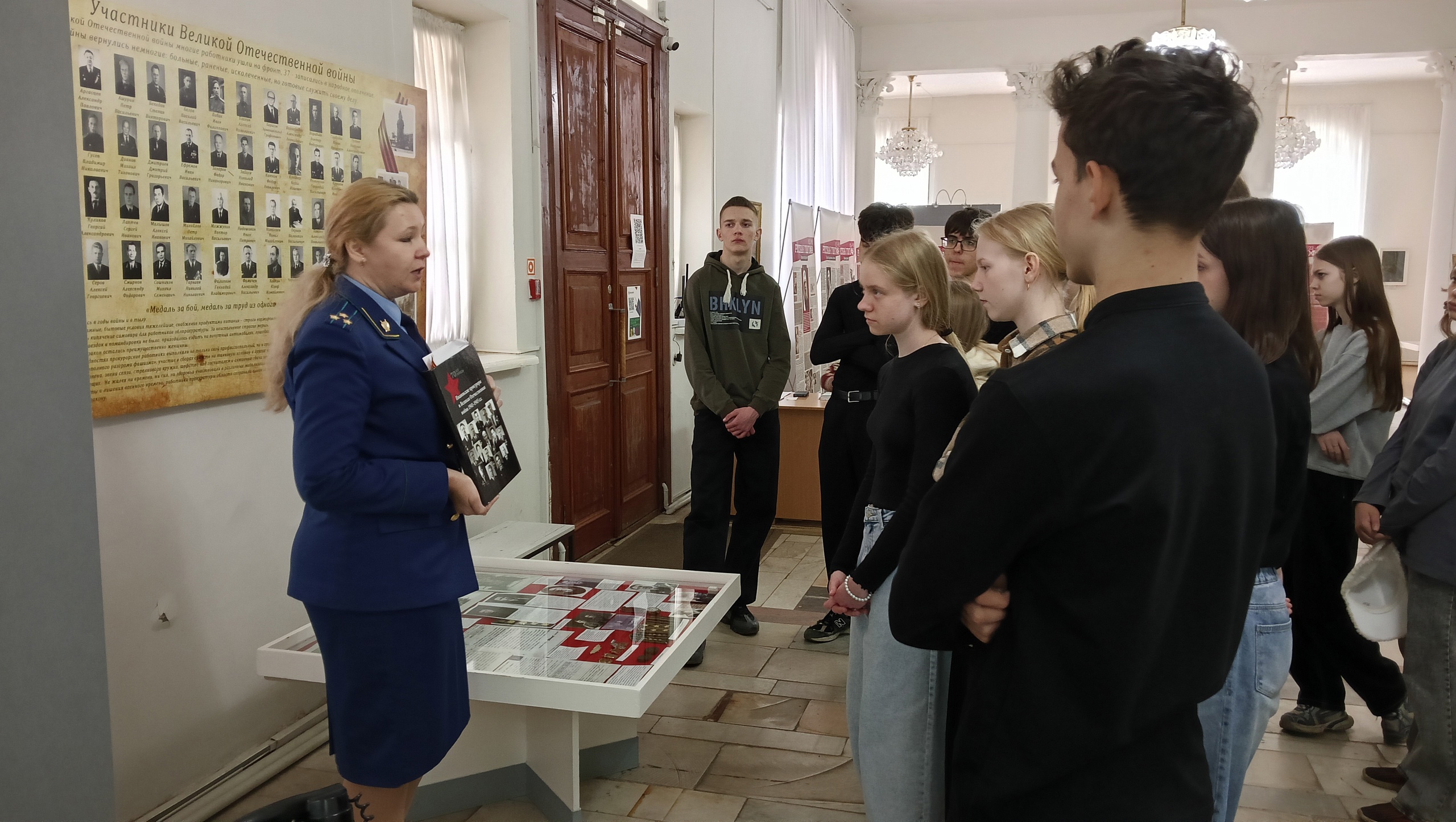 Пенсионер прокуратуры Ивановской области старший советник юстиции Кручинина Валентина Владимировна 22 апреля 2025 года приняла участие в экскурсии по выставке «Свой вклад в Победу внесли», посвященной деятельности органов прокуратуры Ивановской области и ее работников во время Великой Отечественной войны, организованной в Вичугском городском художественном музее для учащихся старших классов школ №№6, 10, 11 г. Вичуга.
